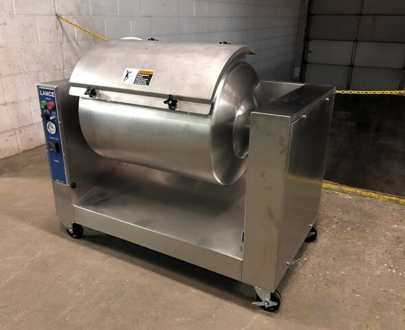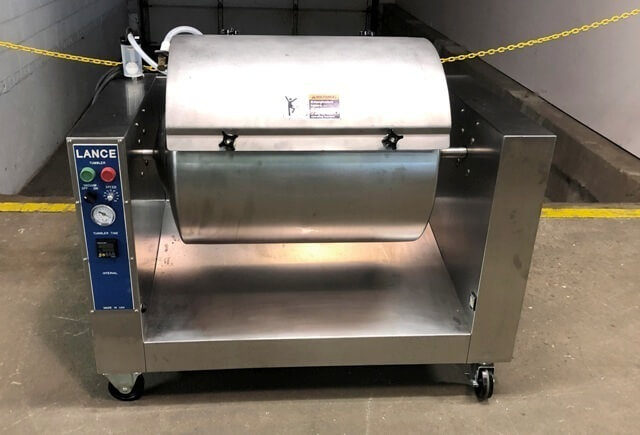 Lance LT-15 Vacuum Tumbler. stainless steel, 200# capacity vacuum tumbler, USDA approved, 1-9 RPM vari-speed drive, 8 hour timer, 115V/1PH//60HZ, mounted on 4″ casters, built-in vacuum pump with liquid trap, Length: 47” / 119.4cm, Width: 27” / 68.6cm, Height: 35” / 88.9cm, 1/4 hp TEFC motor.