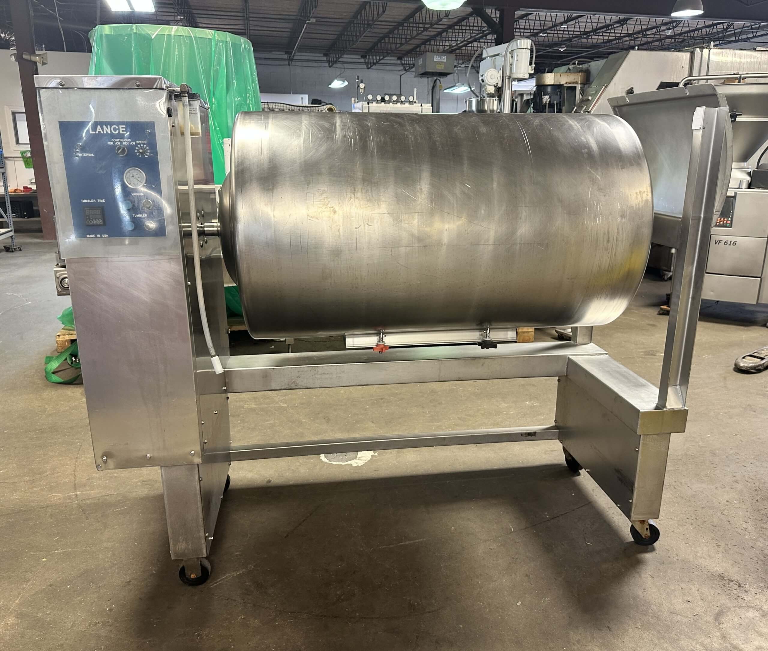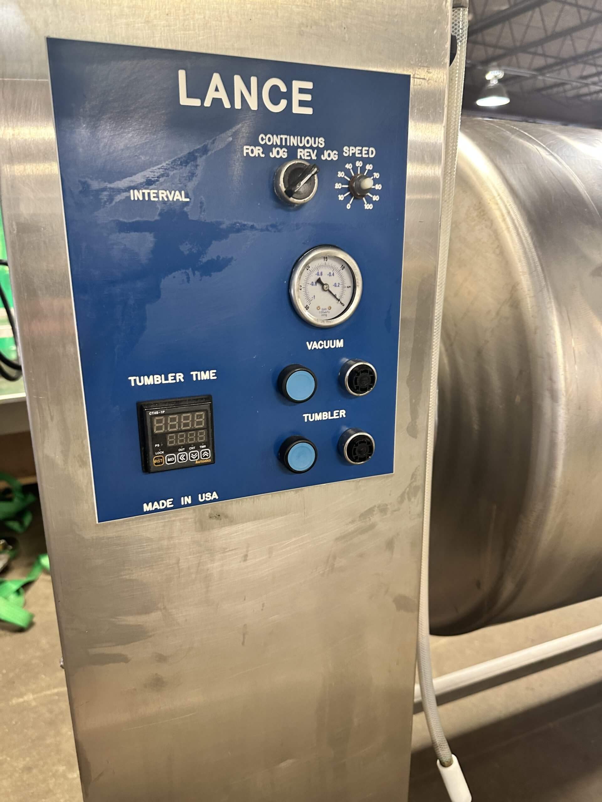 Lance LT-60 Vacuum Tumbler. Stainless steel construction, 1,000# capacity vacuum tumbler, USDA approved, 1-9 RPM vari-speed drive, digital timer, 3/4hp drive motor, 115V/1PH/60HZ, mounted on 4″ casters, self-contained Thomas vacuum pump with liquid trap, mounted on a lift kit.