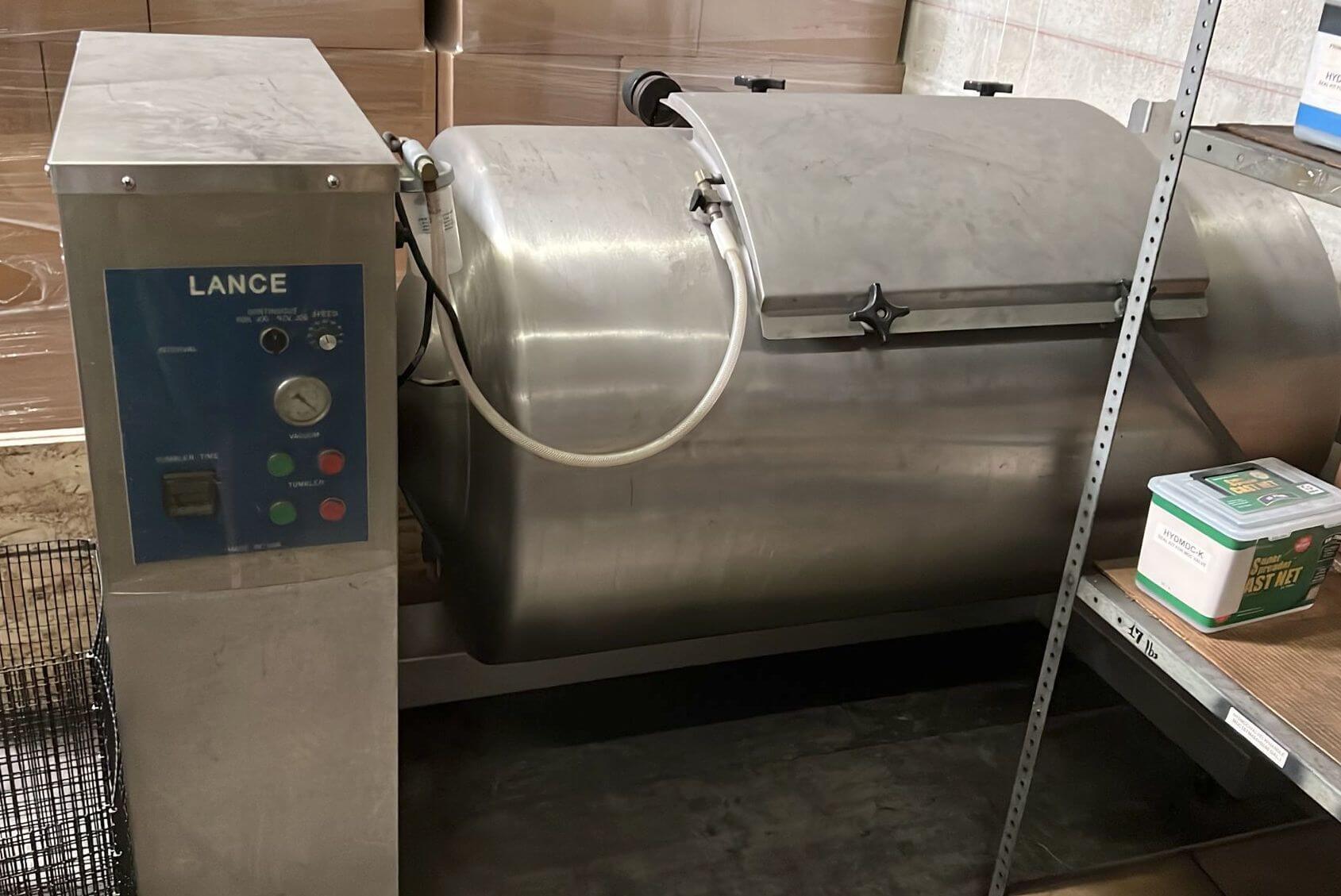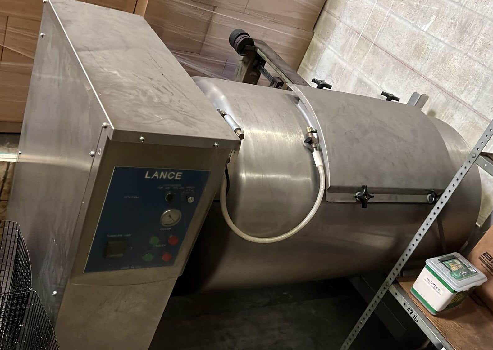 LANCE LT60 Vacuum Tumbler. Stainless steel construction, 1,000# capacity vacuum tumbler, USDA approved, 1-9 RPM vari-speed drive, digital timer, 3/4hp drive motor, 115V/1PH/60HZ, mounted on 4″ casters, self-contained Thomas vacuum pump with liquid trap, 15″ discharge height.