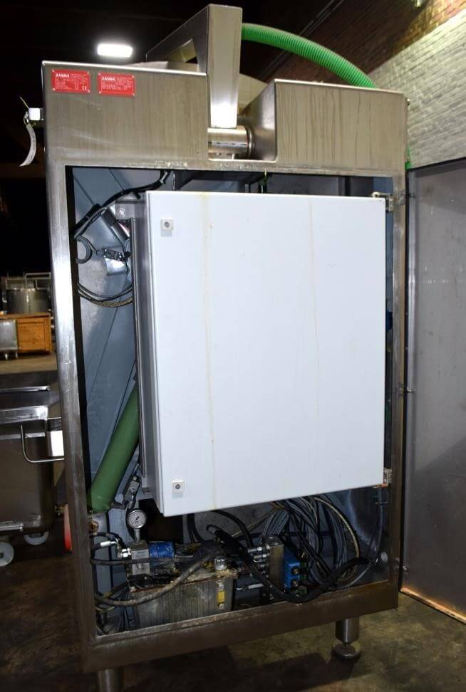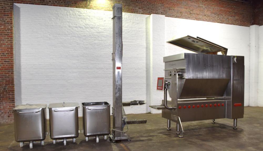LASKA ME 1000 ZNVUX Mixer. Dual overlapping sigma mix blades. All stainless steel construction.1000 liter hopper (1763 Lbs.). Self-contained hydraulic system for bowl tilting/discharge. Domed tilt-back cover suitable for vacuum. 29 hp drive with triple chain. Includes a control panel with drive, operator panel, Laksa Vertical Cart Lift, model BA 24 and (3) stainless steel dump buggies. 480V/3PH/60HZ.