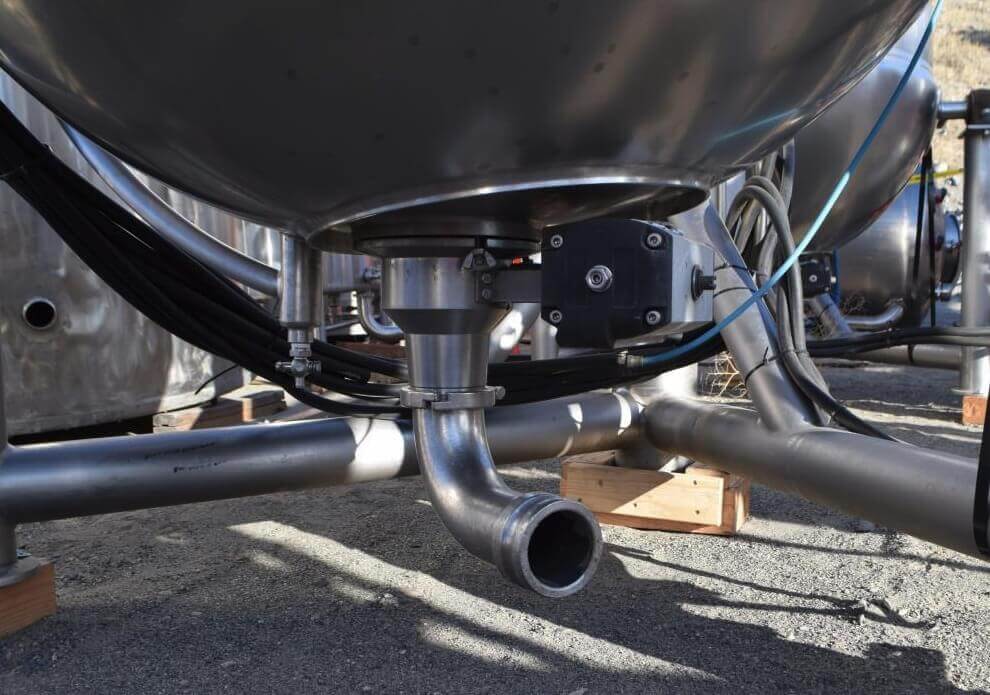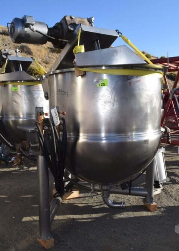 Lee Industries 150DN/INA/2SP Kettle. 150 Gallon, 316 Stainless Steel. Approximate 48″ diameter, 48″ deep, open-top no cover, hemispherical bottom. 304 Stainless steel hemispherical bottom jacket rated 90 psi at -20 to 332 degrees F. Top entering angled anchor style agitator with scrapers, driven by a 7.5 hp, 3/60/208-230/460 volt, 1725 rpm gear motor, 56.55 to 1 ratio. Air-operated agitator tilt. 3″ Center bottom outlet with valve. Mounted on a stainless steel frame with (3) legs.