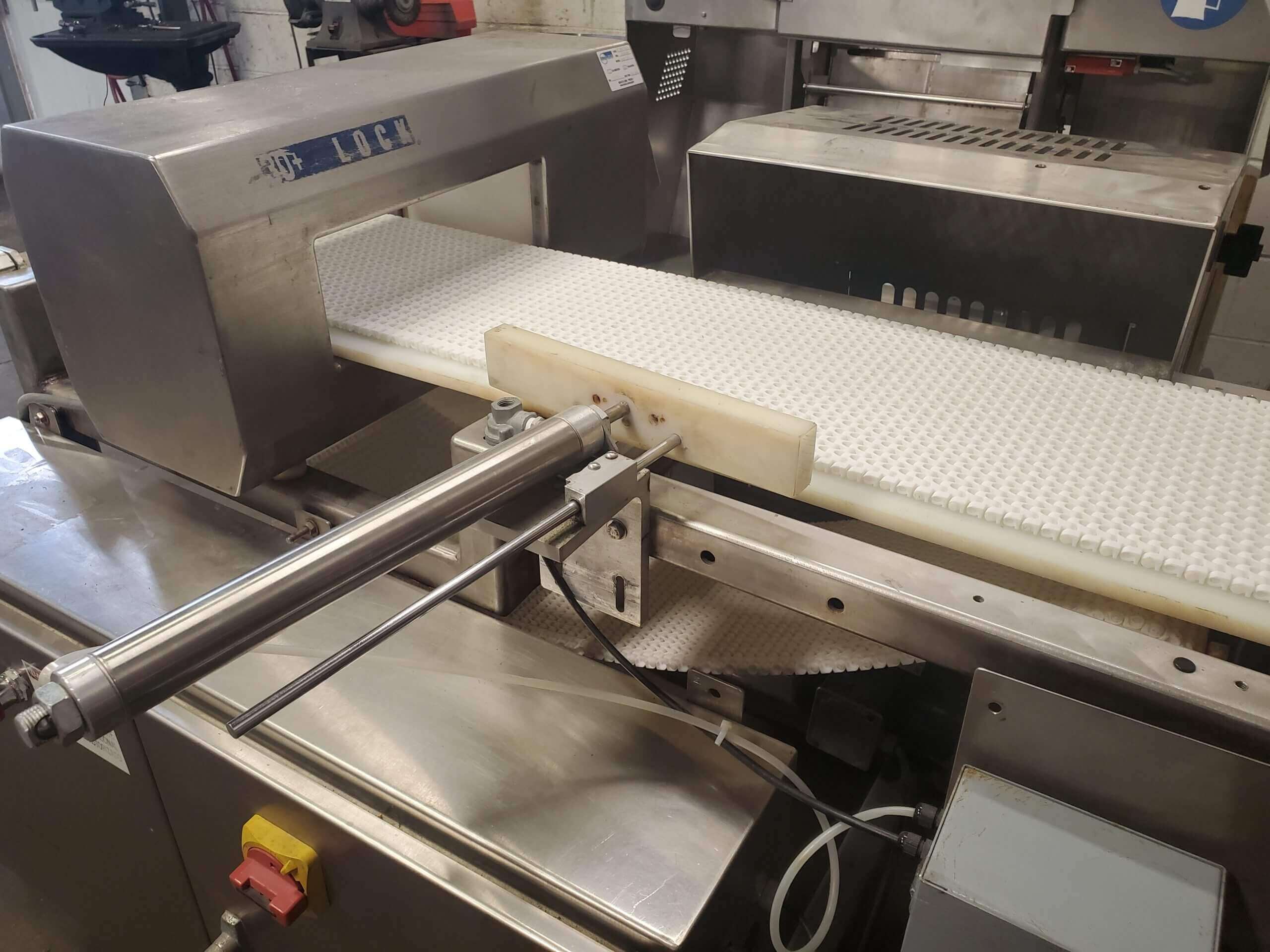 LOCK MET 30+ Metal Detector. Stainless steel construction, 14″ x 5″ aperture, 12″ wide conveyor belt, push reject detection system, right to left direction of flow, 110V/1PH/60HZ.
