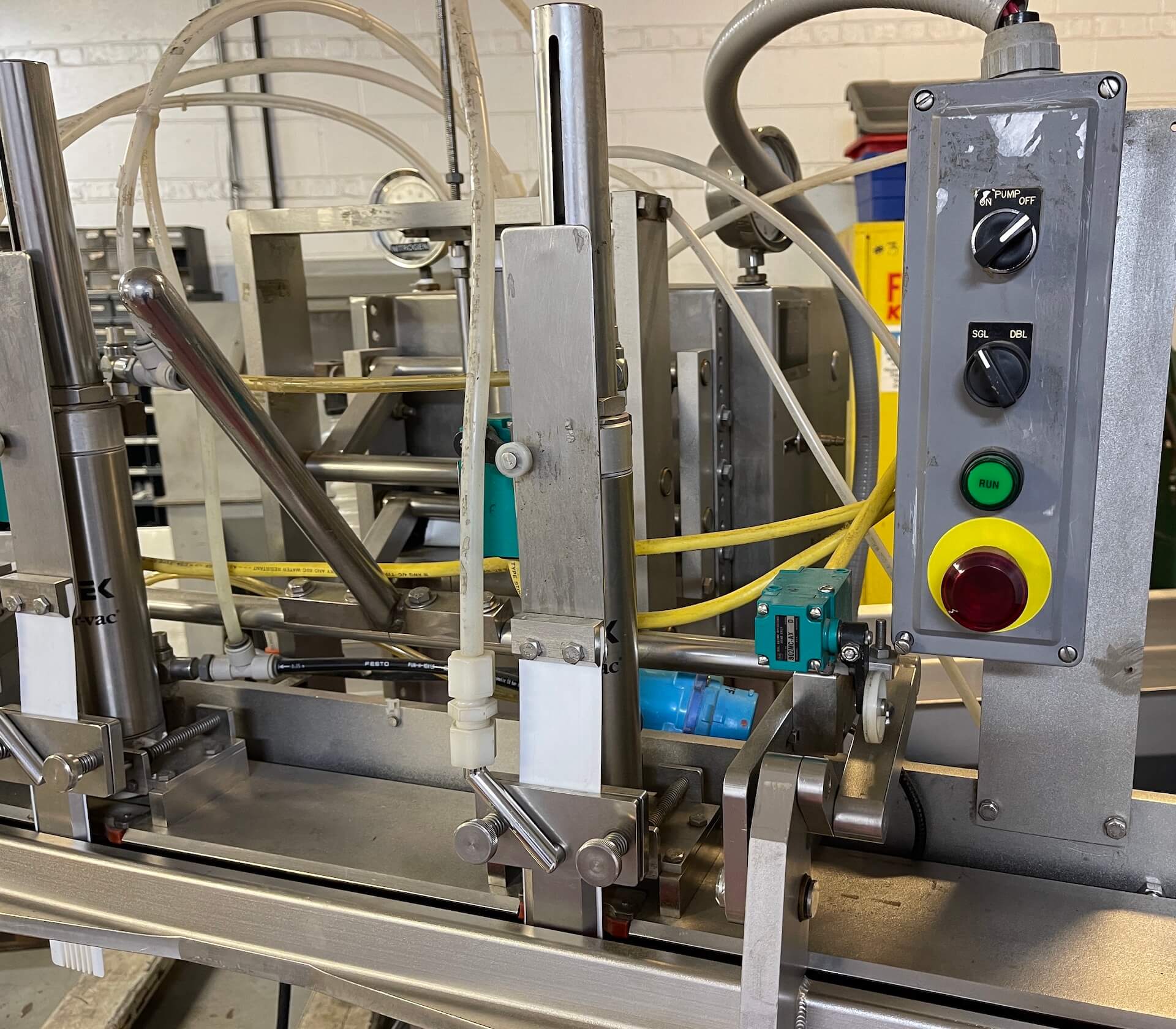 M-TEK MARK III Packaging Machine. 53″ heat seal bar, 18″ center to center nozzles, Twin 9-1/4″ vacuum probes, Vacuum pump, 230V/3PH/60HZ Minimum compressed air 110 psi/7.5 bar, Gas flush canister, Maximum 125 psi/8.5 bar.