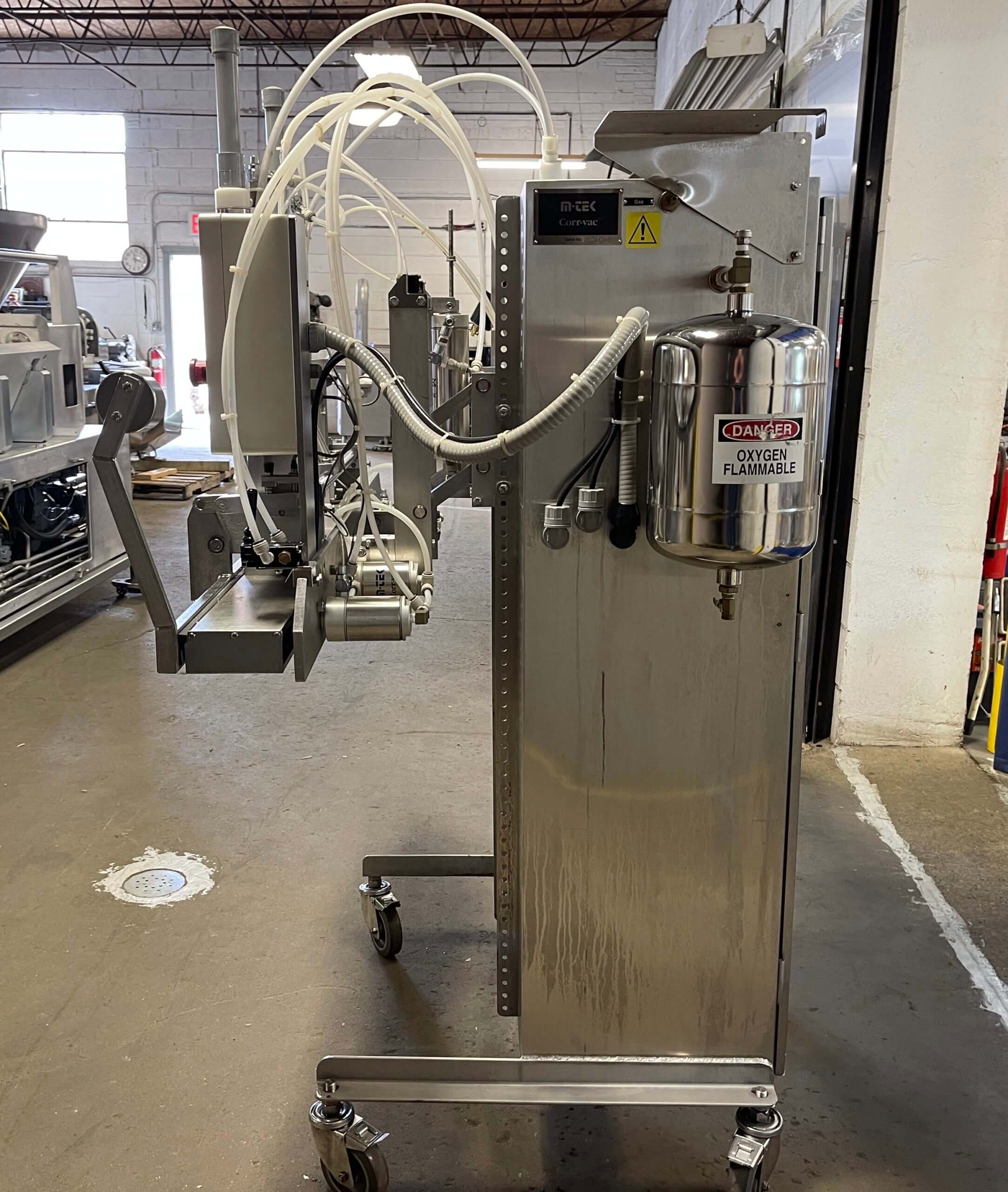 M-TEK MARK III Vacuum Packaging-Chamber. 53″ heat seal bar, 18″ center to center nozzles, Twin 9-1/4″ vacuum probes, Vacuum pump, 230V/3PH/60HZ Minimum compressed air 110 psi/7.5 bar, Gas flush canister, Maximum 125 psi/8.5 bar.