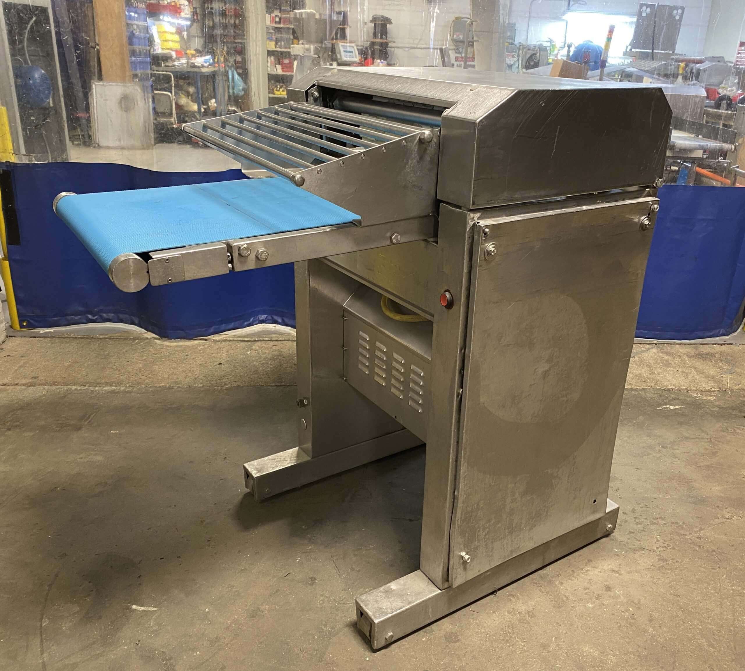 Maja Automatic Feed Skinner. 17″ wide tooth roller. Includes in feed conveyor with neoprene belting. Top pressure hold down rollers. 3/4hp motor, 230V/3Ph/60Hz. Offered in as is condition.