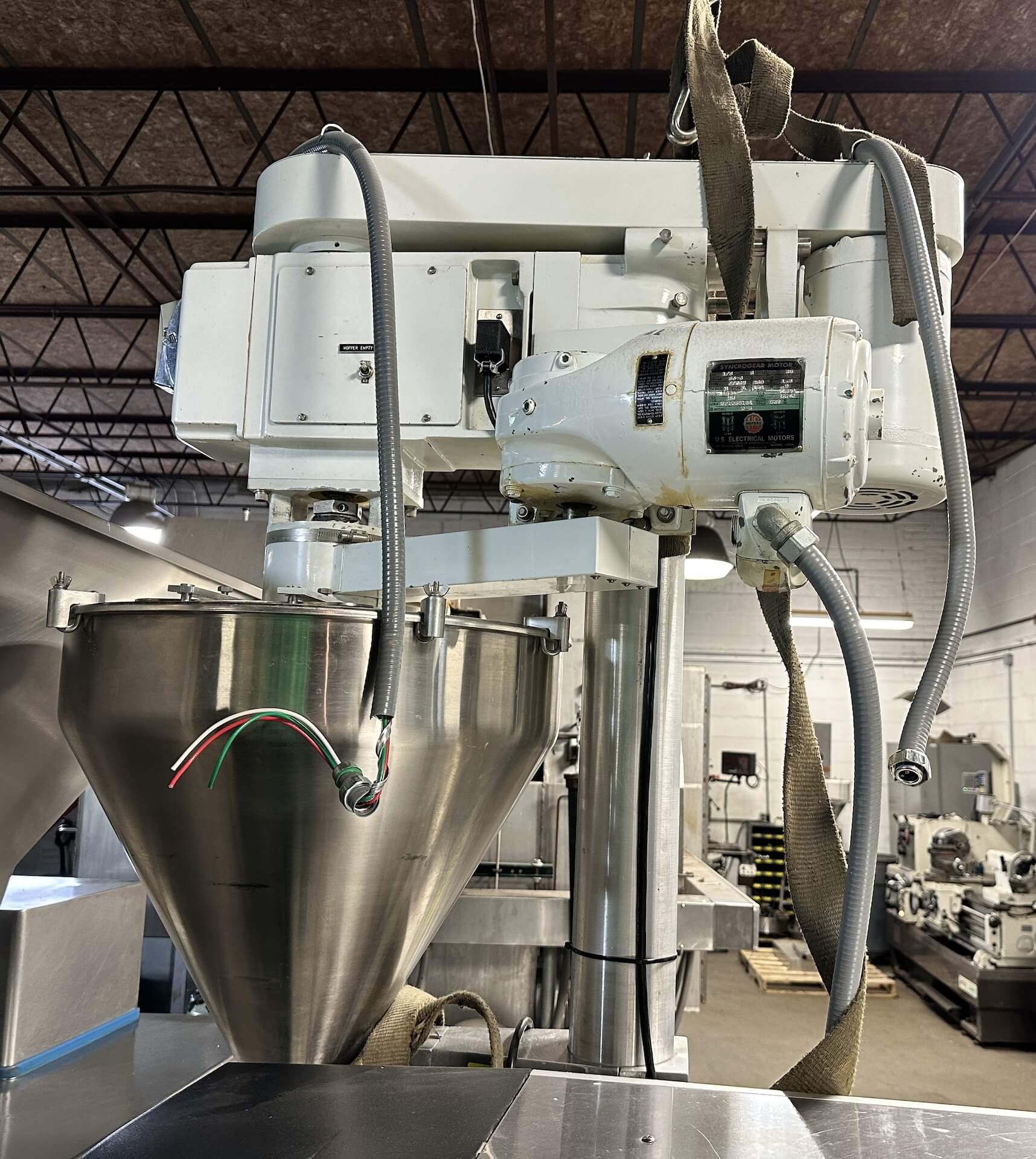 Mateer Powder Filler accurately fill a wide variety of products, including free-flow powders and granules and non-free-flow powders, liquids, creams, pastes, and slurries. 1 hp Baldor heavy duty motor to supply hopper, 1/3 hp motor agitation motor. Vertically mounted, 220V/3PH/60HZ.