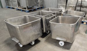 600 lbs. Dump Buggies. Stainless steel construction. (4) 6″ X 1-1/2″ pol...