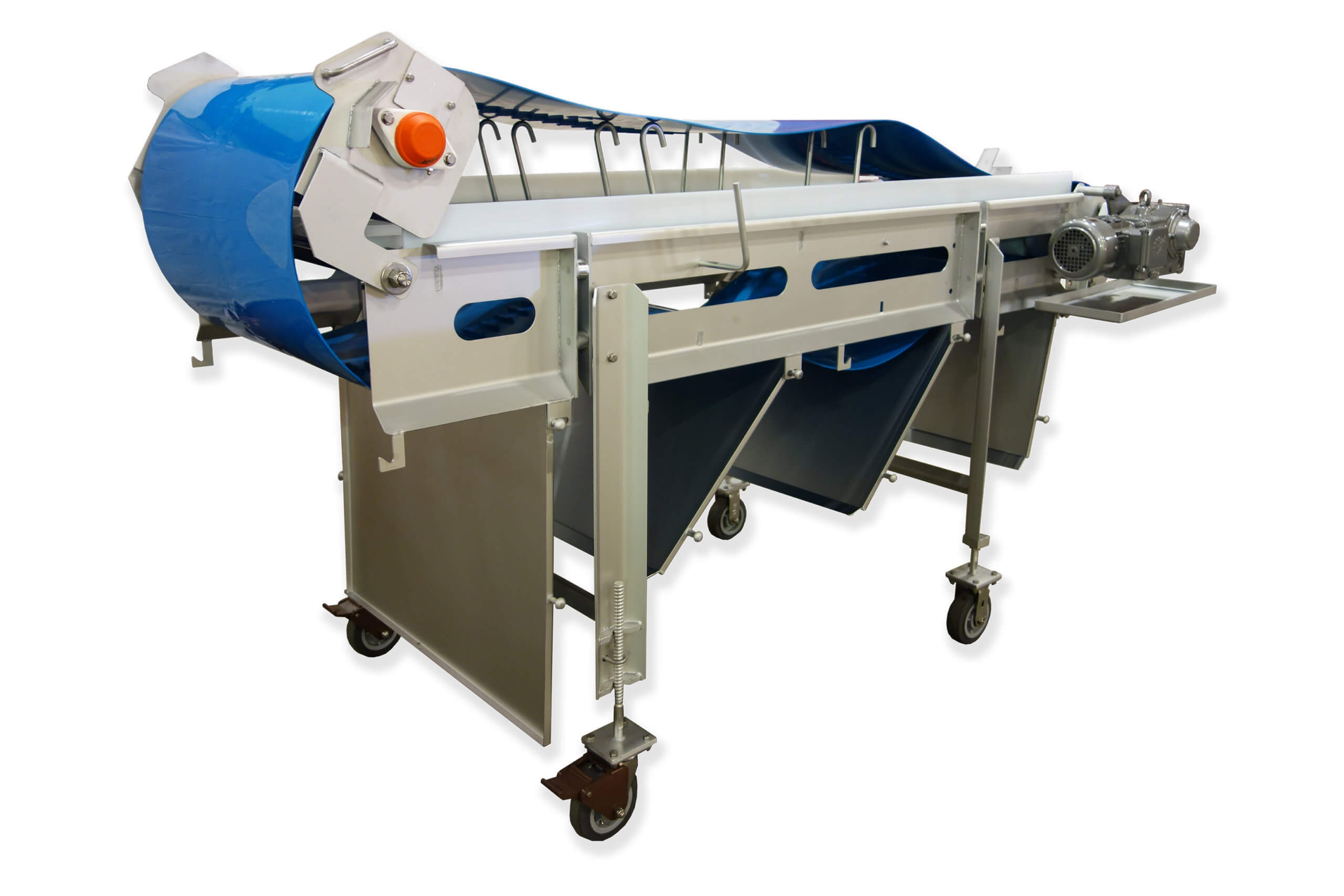 MEPACO Sanitary Conveyor. New stainless steel construction, OD: 105″ long x 47″ wide x 46″ tall. 30″ wide blue neoprene conveyor belt. Sanitary features: Lift up idle ends, cleaning lift hooks, Removable guide rails, swing-away drip pan, stainless steel pulleys, motor & gearbox and casters. 440/220V/3PH/60HZ.