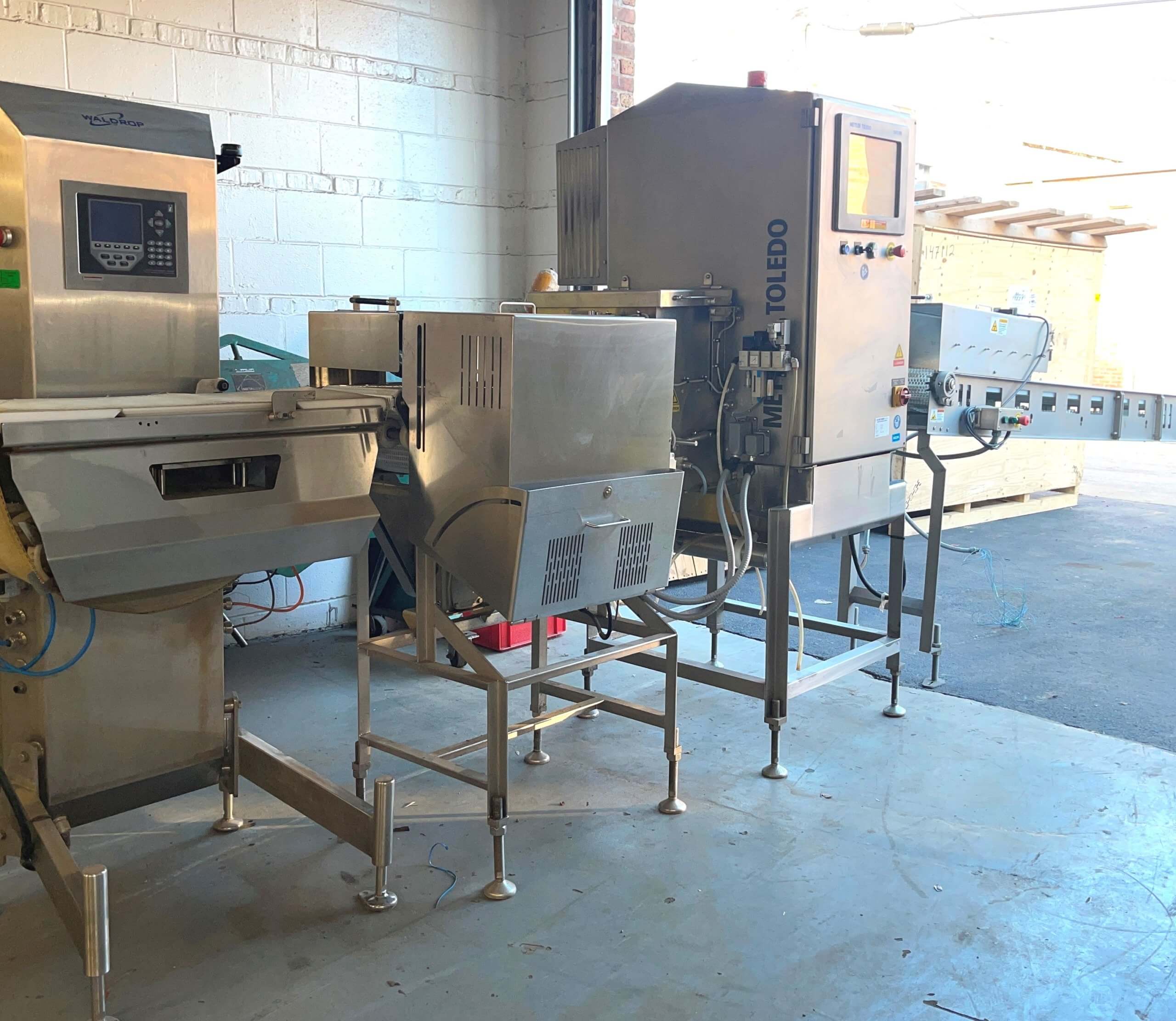 METTLER TOLEDO Powerchek 250 X-Ray Machine. Ensures product safety through the detection of contaminants such as glass, metal, stone and plastic products. Automatic product set-up, color 15” touch screen, aperture dimensions 2” tall x 3.375” wide. 11” x 62.5 long conveyor belt, right to left product flow. Includes Waldrop Check Weigher and Friensen infeed and exit conveyors with air product reject and control panel. 220V/3PH/60HZ.
