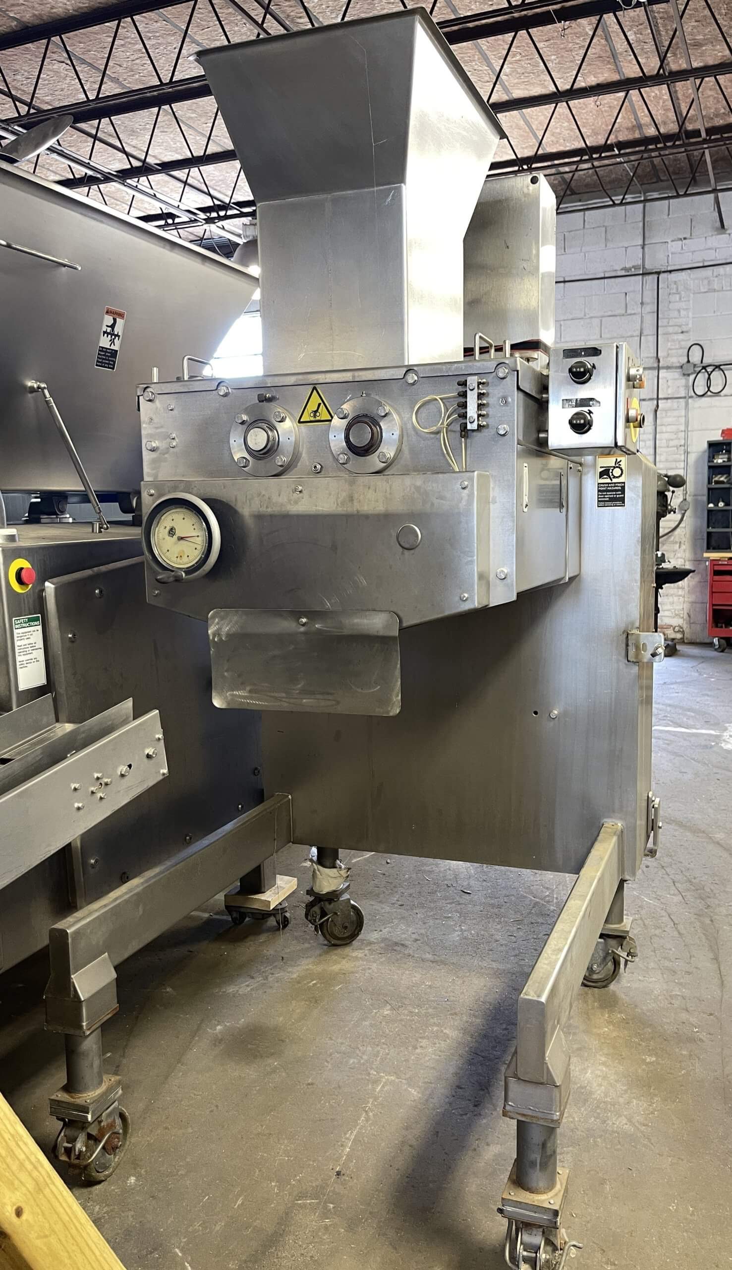 MOLINE NA Dough Former. Designed to deliver a continuous flow to the sheeting system. Extrudes 24″ wide dough sheets, 2 hp drive motor, 1725 RPM, all stainless steel construction.