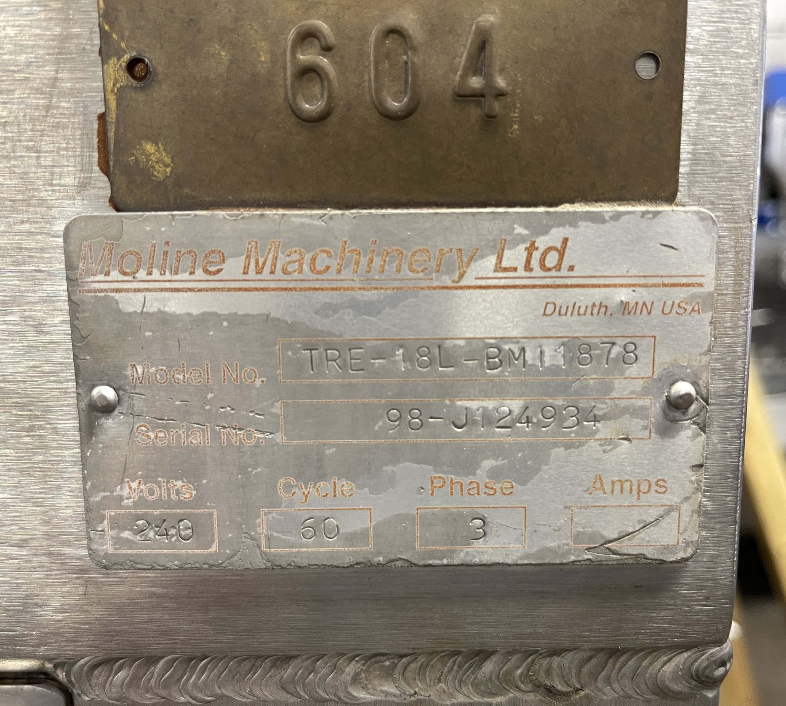 MOLINE TRE18LMB1878 Dough Former. Designed to deliver a continuous flow to the sheeting system. Extrudes 18″ wide dough sheets, 2 hp drive motor, 1725 RPM, all stainless steel construction.