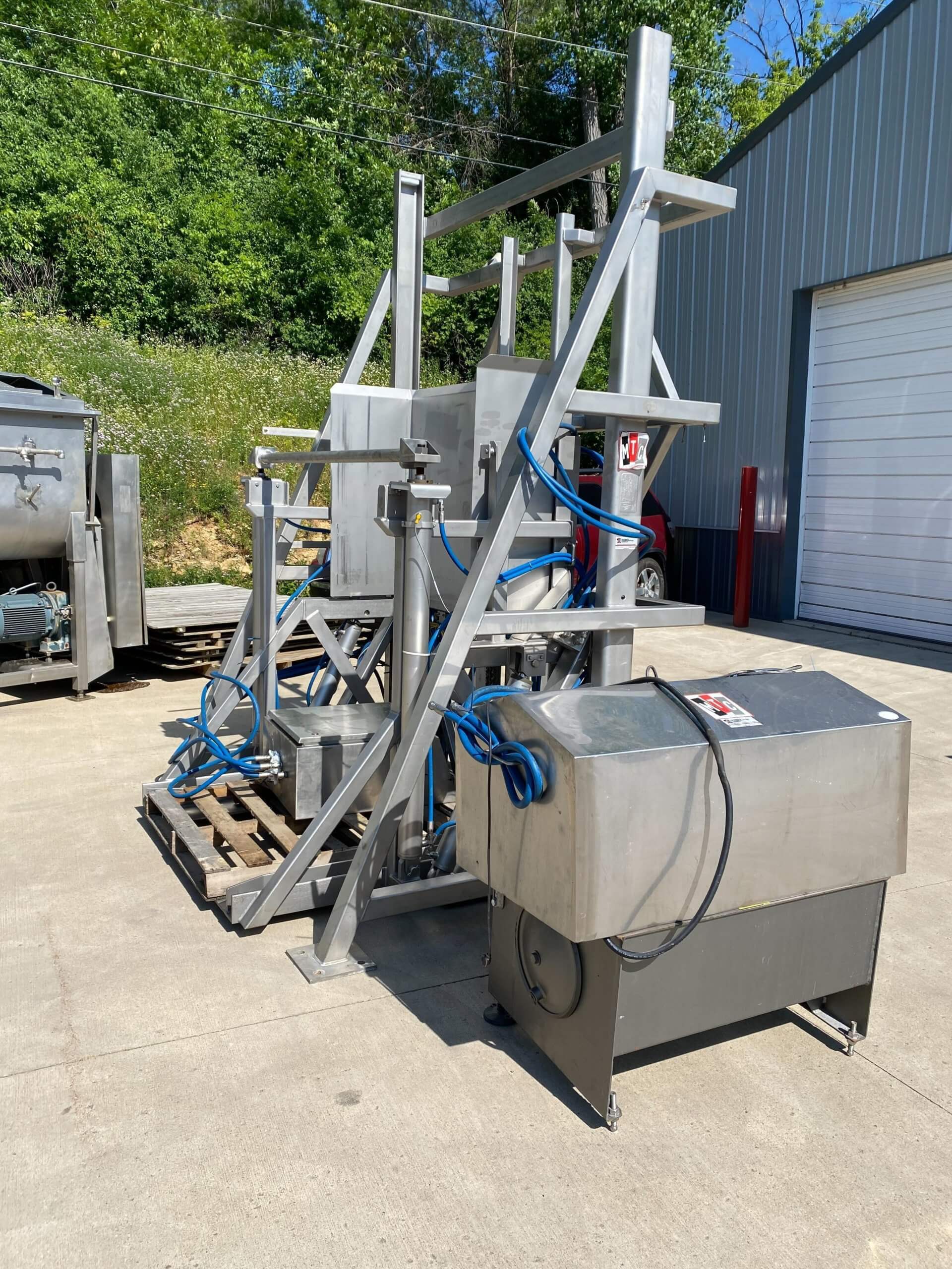 MTC H-LE-S Lift and Pivot Vat Dumper. All stainless steel construction, 4,000 Lb. lift capacity. Pivot point at 120″, dumps at 8′. Basket is 56″ wide X 52″ deep, 10HP power pack, 220V/460V/3PH/60HZ.