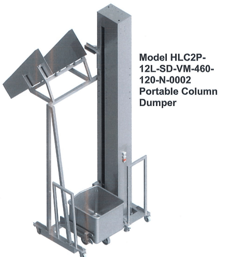 MTC HLC-2 Cart Lift. Left hand portable column dumper. 800 Lbs. capacity. Adjustable dump height up to 82″ discharge height. 12’7″ height, mounted on portable base. 440/220V/3PH/60hz.