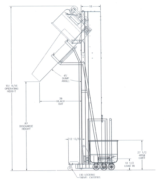 Floor Mount Lug Dumper, 100lbs. lift capacity, 27” wide X 34” long X 91-5/8” T...
