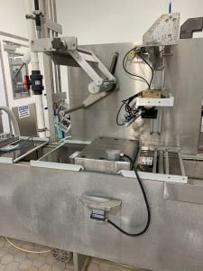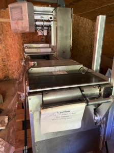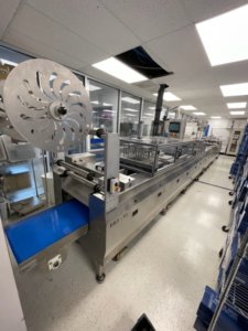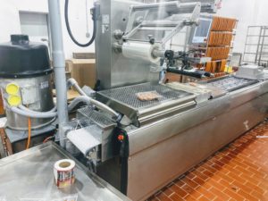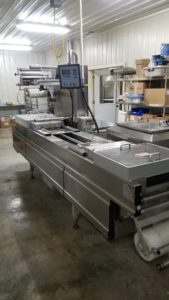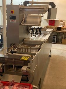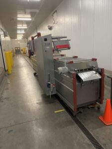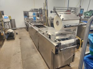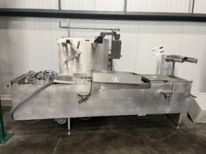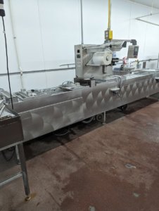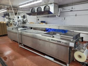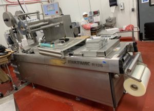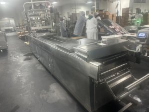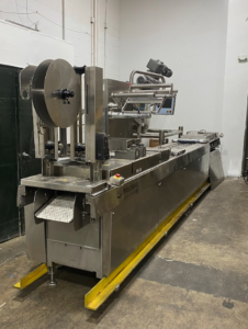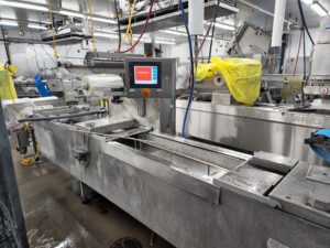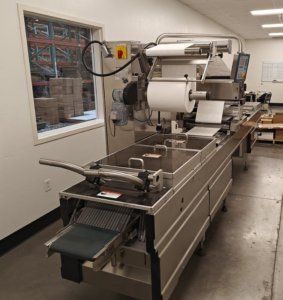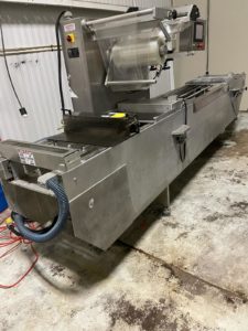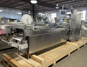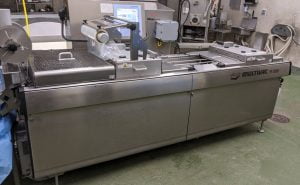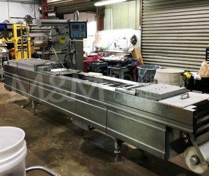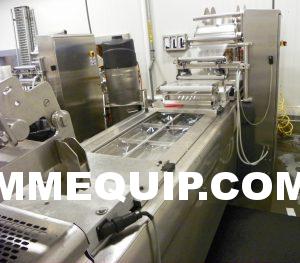MULTIVAC R 175 MF Thermoformer Multi fresh packaging machine, 177″ overall length, with the cross cut overall length is 305″, 420mm web width x 300mm advance. Rigid film bottom web. Includes Busch R5-RA vacuum pump, Dimplex Model JHI-1000-CM recirculating water chiller, Video Jet Data flex thermal transfer printer, MR635 UP labeler, hole punch system, and (3) sets of inserts: 2 X 3, 1 X 3, 1 X 2, and 2 X 2. 220V/3ph/60hz.