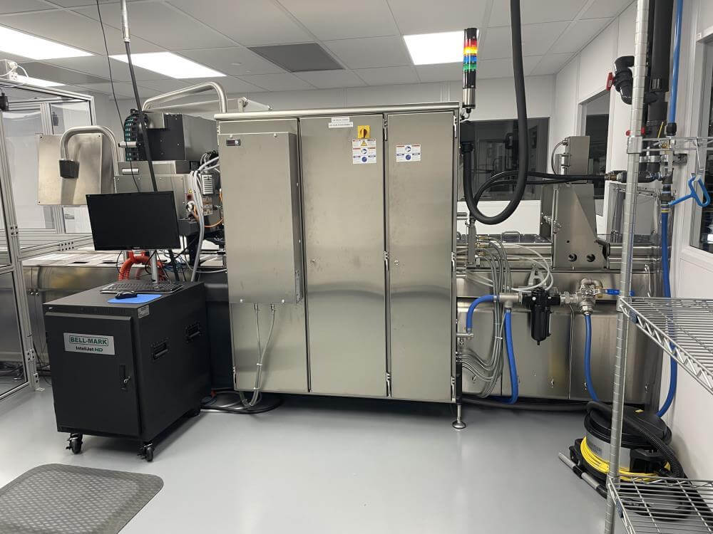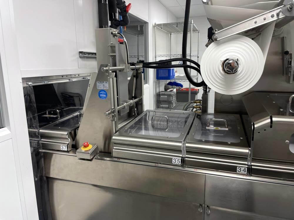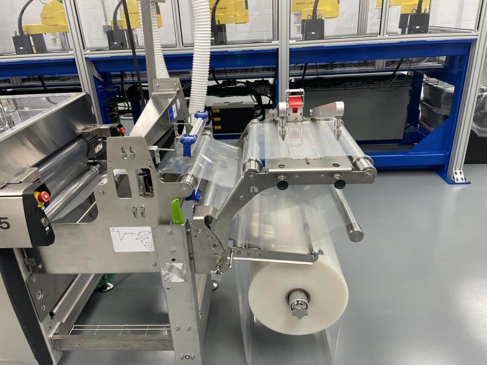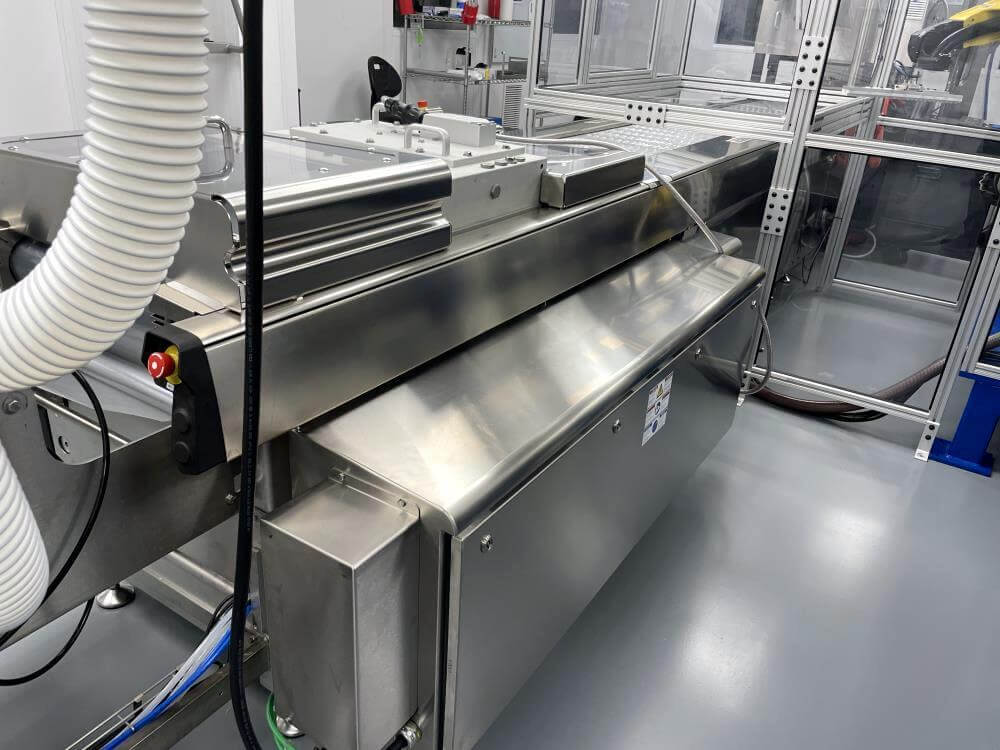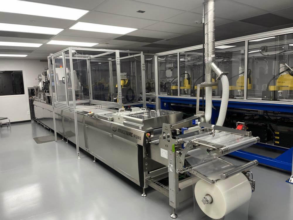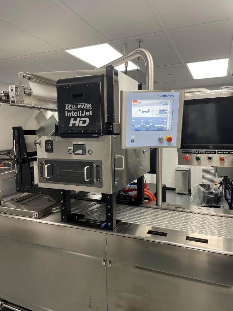 Thermoformer Multivac R245 Horizontal Thermoform Packaging Machine With Fanuc robotic feeders, a Multivac Model R245 horizontal thermoformer is in like-new condition. Swabs for diagnostic test kits were the original intended use. has an IDI automation loading system that can load Multivac pockets with swabs. Fanuc Scara Robots are among them. Tyvek or flexible Top Web Films (Tb Web): 405mm width with a +/- 1mm tolerance Three mils thick. Bottom Web (flexible), PA/PE type, 422mm wide, +2mm tolerance, 5.9mil thick. has a sanitary stainless steel design. Has a powered film unwind with splice tables (top and bottom web), a servo-driven chain advance with a holding brake, and a lifting mechanism. A chiller, printer, and vision system are all included in the print registration, central lubrication system. Intelijet HD Servo WAS Piezo printing system by Bell-Mark, 420mm. removing trim.currently tooled for a two cavity, 13 track die. 380mm for the cutoff and 19mm for the edge trim. JHI-1500-CM Recirculating Water Chiller by Dimplex. The machine is still installed and is currently running. Removal costs are at the buyers expense.