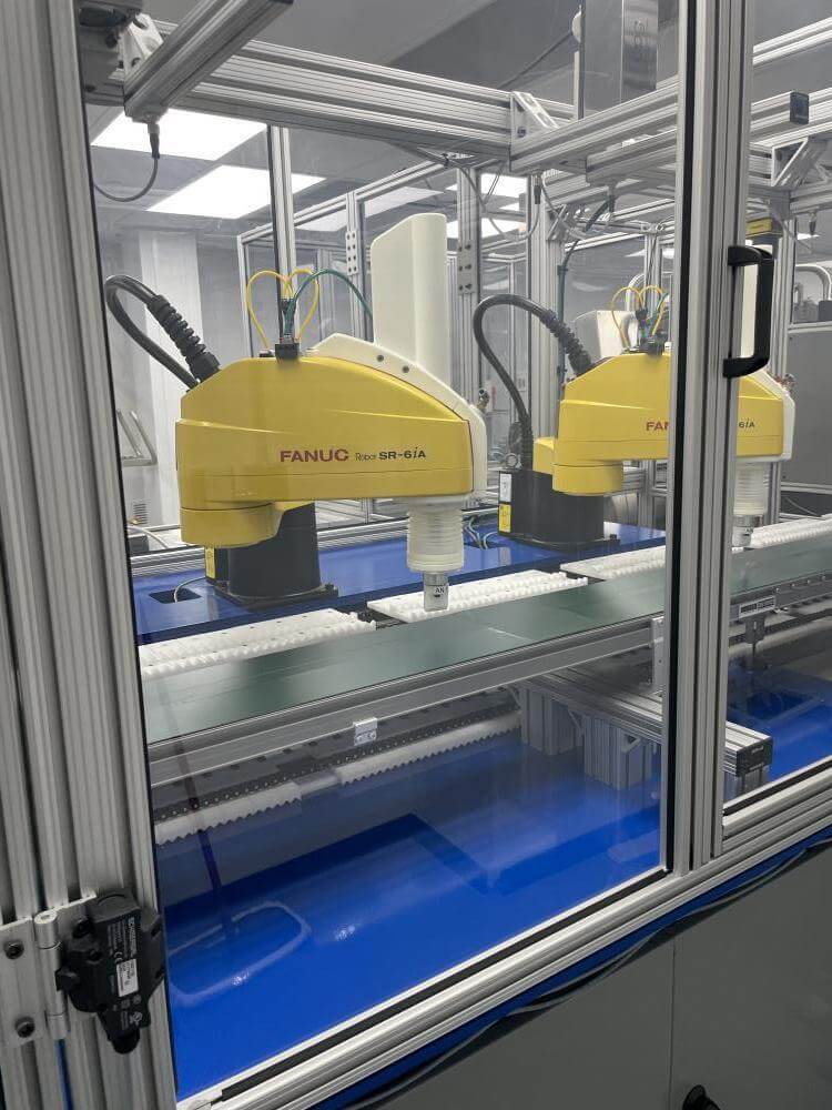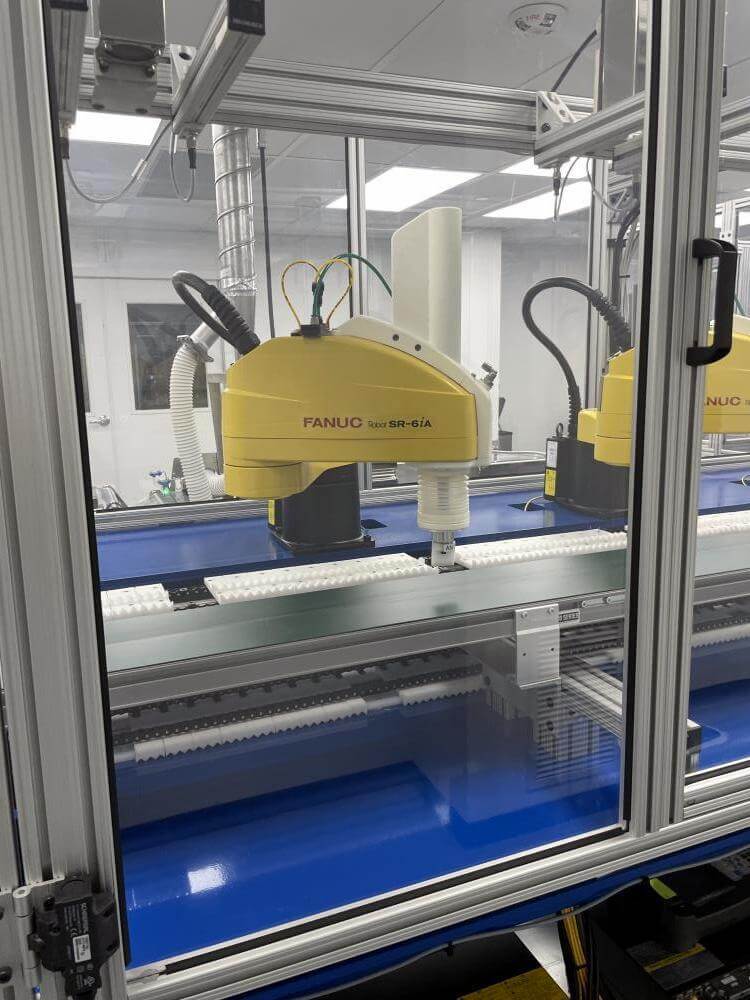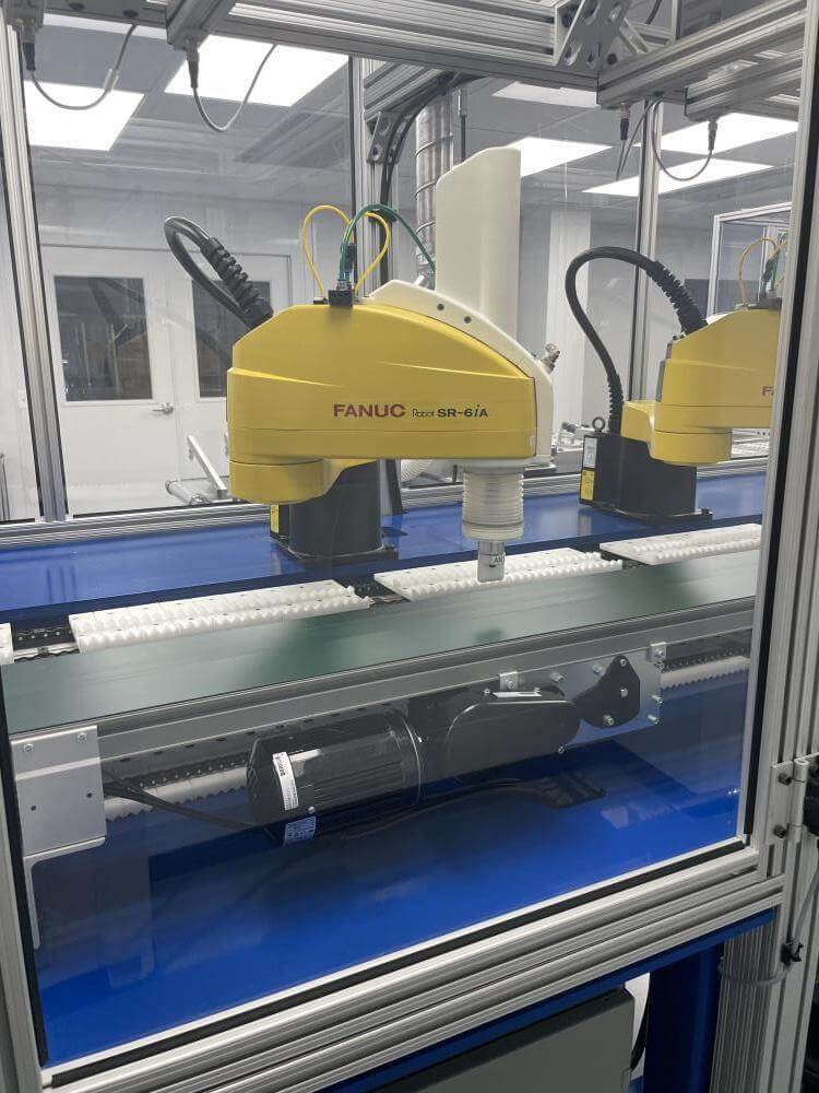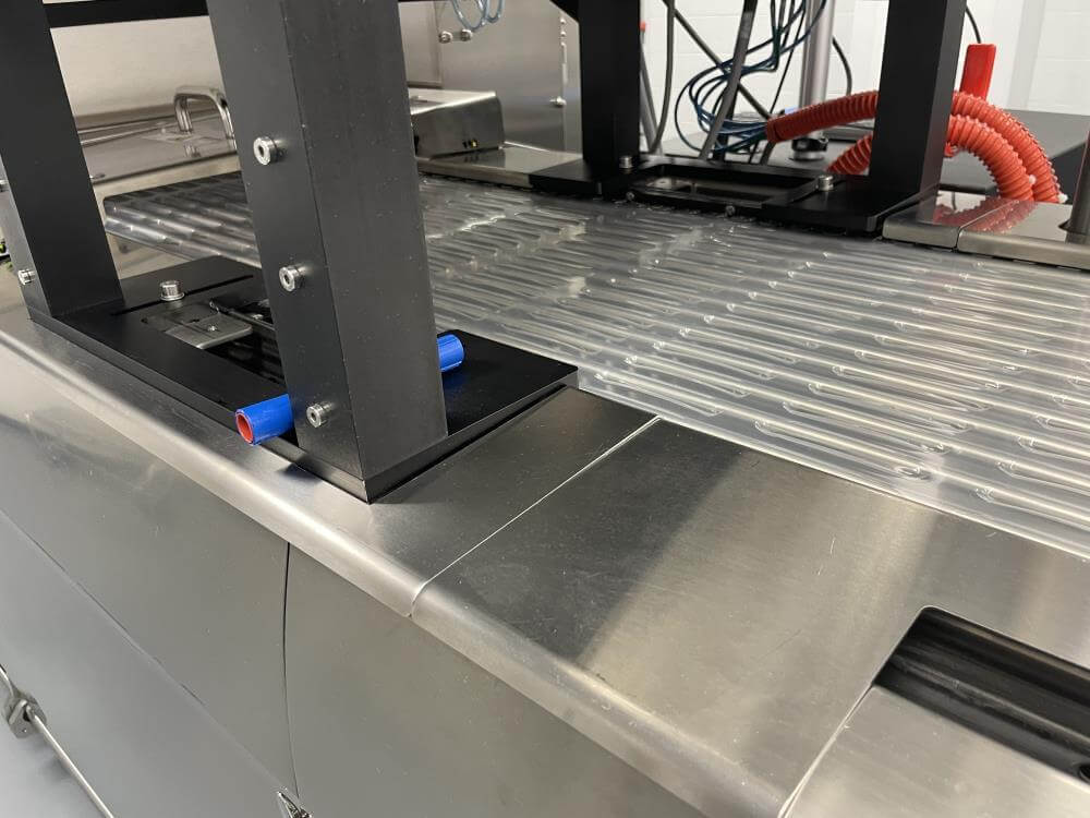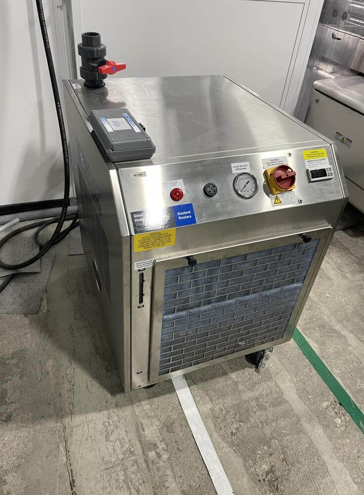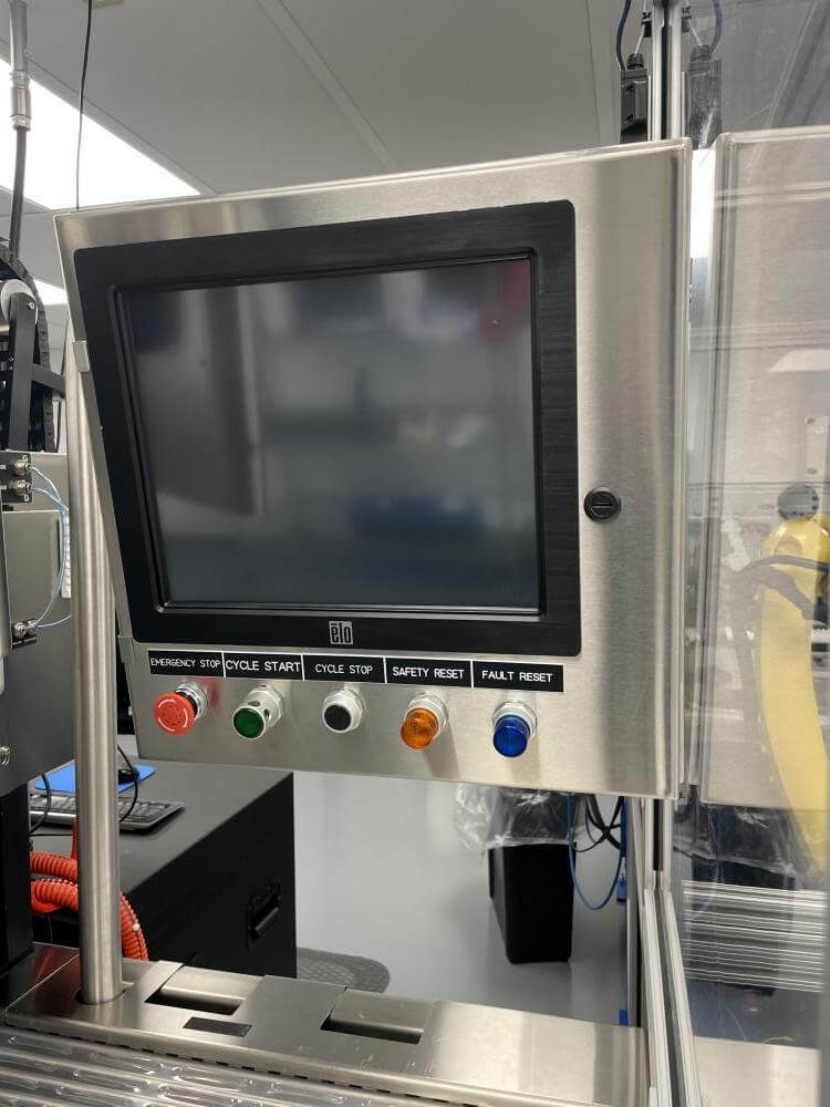 Thermoformer Multivac R245 Horizontal Thermoform Packaging Machine With Fanuc robotic feeders, a Multivac Model R245 horizontal thermoformer is in like-new condition. Swabs for diagnostic test kits were the original intended use. has an IDI automation loading system that can load Multivac pockets with swabs. Fanuc Scara Robots are among them. Tyvek or flexible Top Web Films (Tb Web): 405mm width with a +/- 1mm tolerance Three mils thick. Bottom Web (flexible), PA/PE type, 422mm wide, +2mm tolerance, 5.9mil thick. has a sanitary stainless steel design. Has a powered film unwind with splice tables (top and bottom web), a servo-driven chain advance with a holding brake, and a lifting mechanism. A chiller, printer, and vision system are all included in the print registration, central lubrication system. Intelijet HD Servo WAS Piezo printing system by Bell-Mark, 420mm. removing trim.currently tooled for a two cavity, 13 track die. 380mm for the cutoff and 19mm for the edge trim. JHI-1500-CM Recirculating Water Chiller by Dimplex. The machine is still installed and is currently running. Removal costs are at the buyers expense.