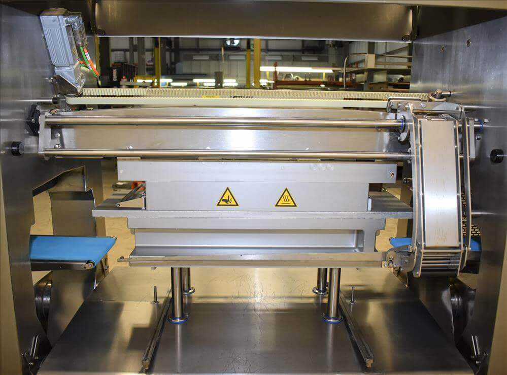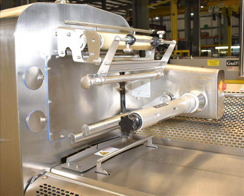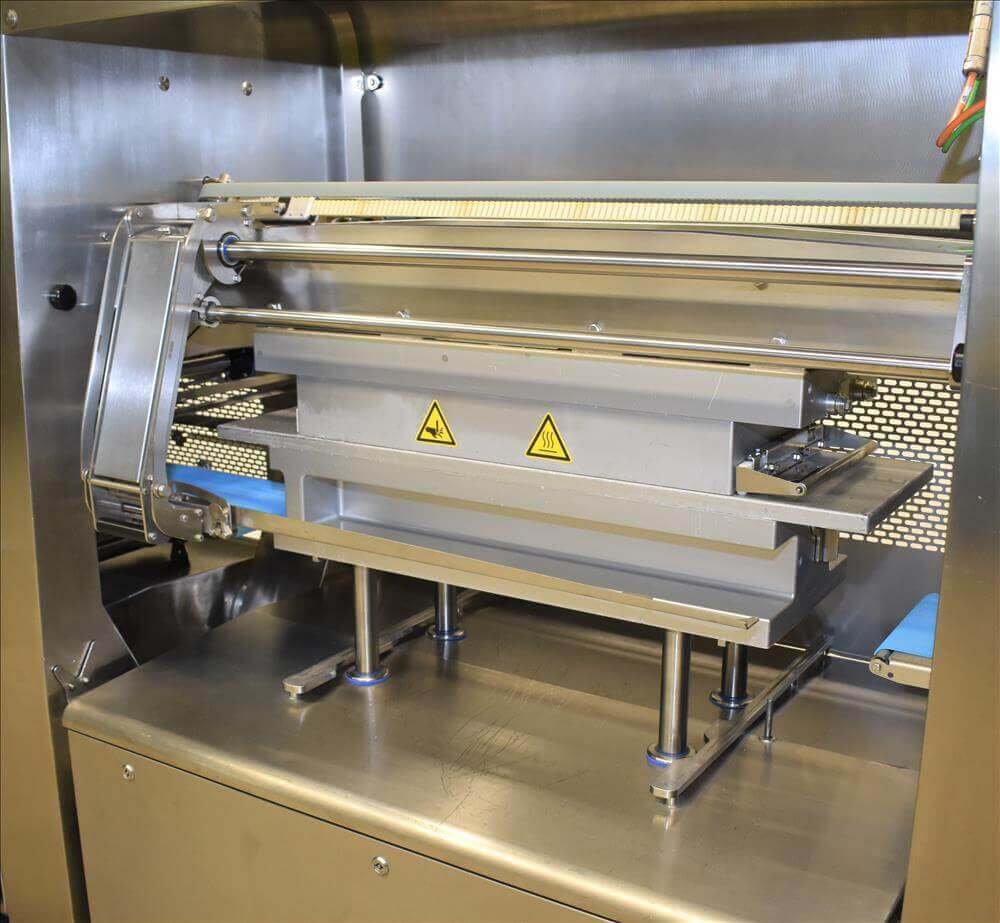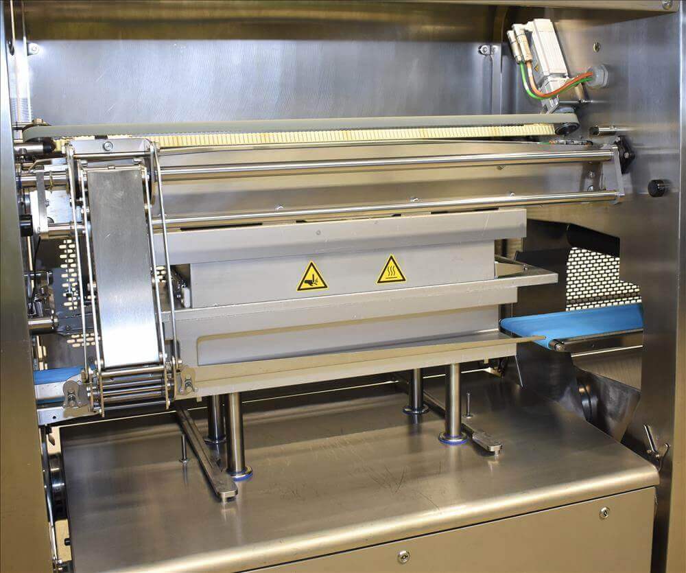 Automatic flow-wrapping machine designed to pack fresh food products with shrink bar...