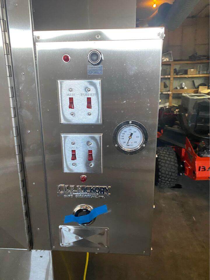 Like New Ole Hickory Pits wood burning BBQ Pit Oven. All stainless steel construction. Two (2) 65,000 BTU burners with electronic ignition. Thermostat control range 100 degrees F. to 325 degrees F. (30) 18″ x 60″ cook racks for 225 SQ. FT. cooking surface. Single 1100 RPM fan. Rotisserie advance foot switch. 110V/1PH/60HZ. Includes Smoke evacuator.