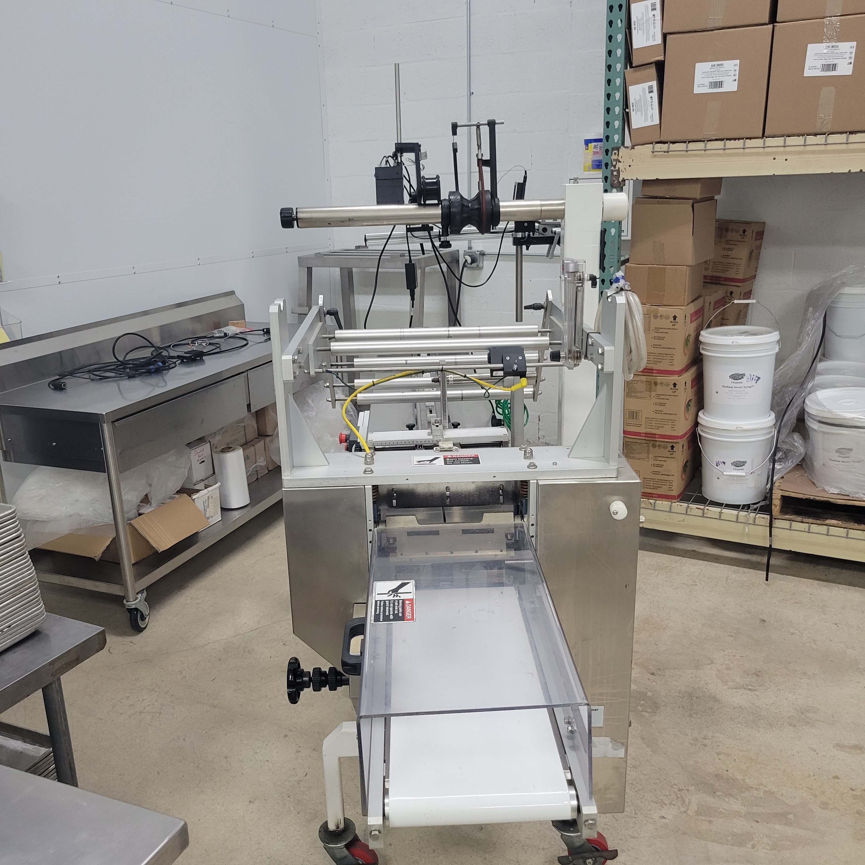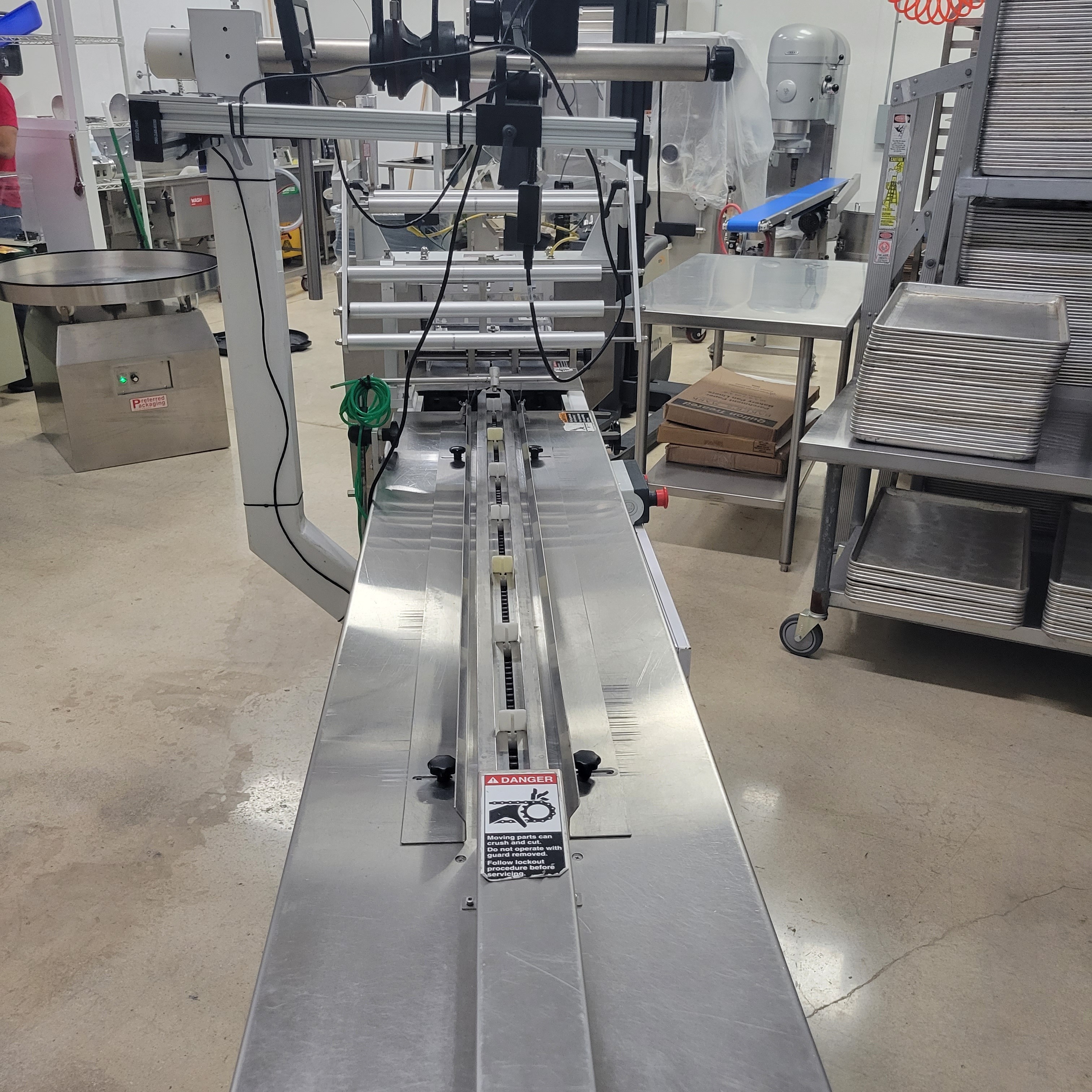 PFM 30S Super Horizontal Flow Wrapper. (2) Up 9″ wide sealing jaws, Automatically produces closed packets with three seals from heat-sealable packaging material. Packaging speed from 60 to 100 packs per minute. 4′ long infeed on 7″ lug centers, Digital temperature controls, 220V/1PH/60Hz, 15 amps.