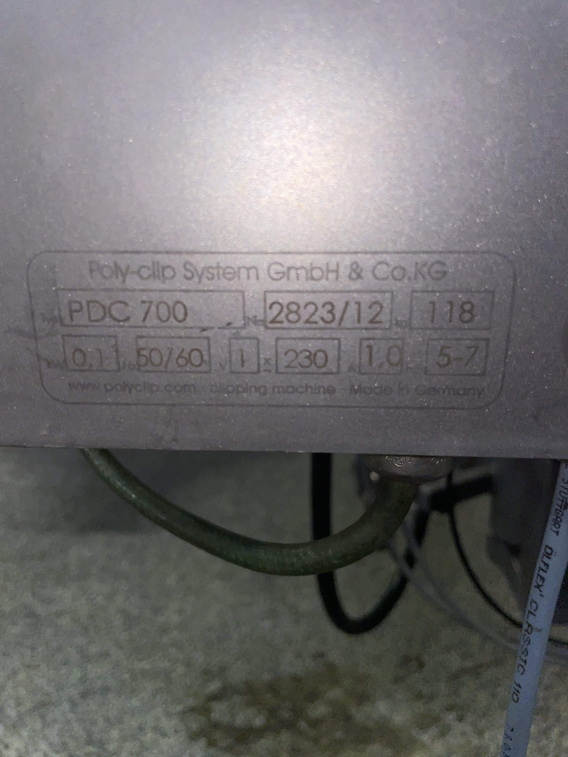 POLY CLIP PDC 700 Semi-Automatic Clipper for continuous production. Closes casings up to 115 mm. 400 clip capacity. Double clip magazine. Suitable for clip sizes: S- 725/740/744. 230V/1PH/60HZ, Requires 5-7 bar compressed air.