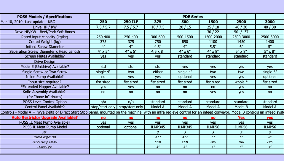 POSS PDE-375 Mechanical Bone Separator. 10hp motor, 300-600 kg/hour, 4.5″ infeed screw diameter, start/stop control panel, 460V/3Ph/60Hz.