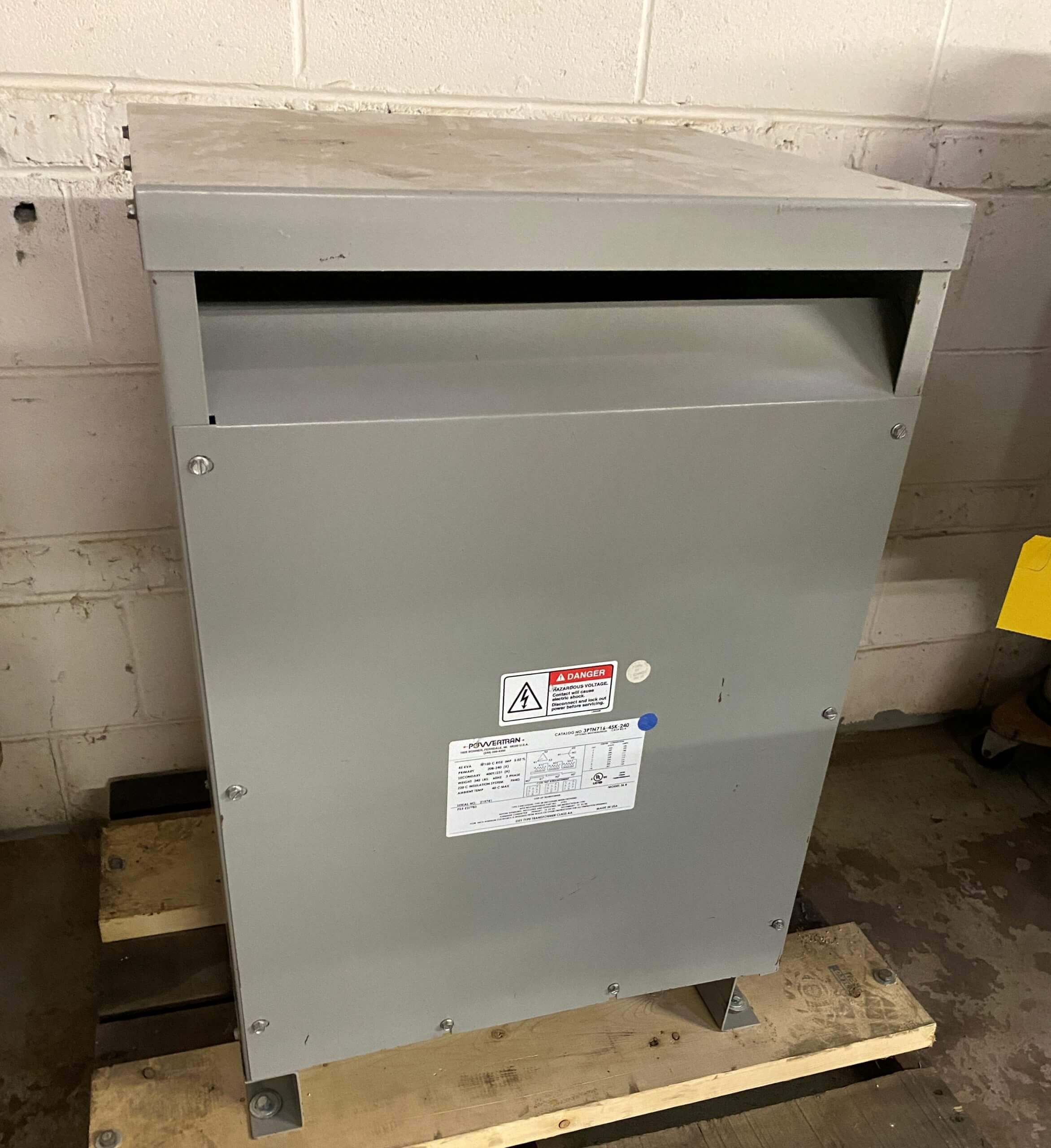 Powertran 36B Transformer. 45 KVA, 60HZ, 3PH. 208-240V primary, secondary 400Y, Net weight 340 Lbs.