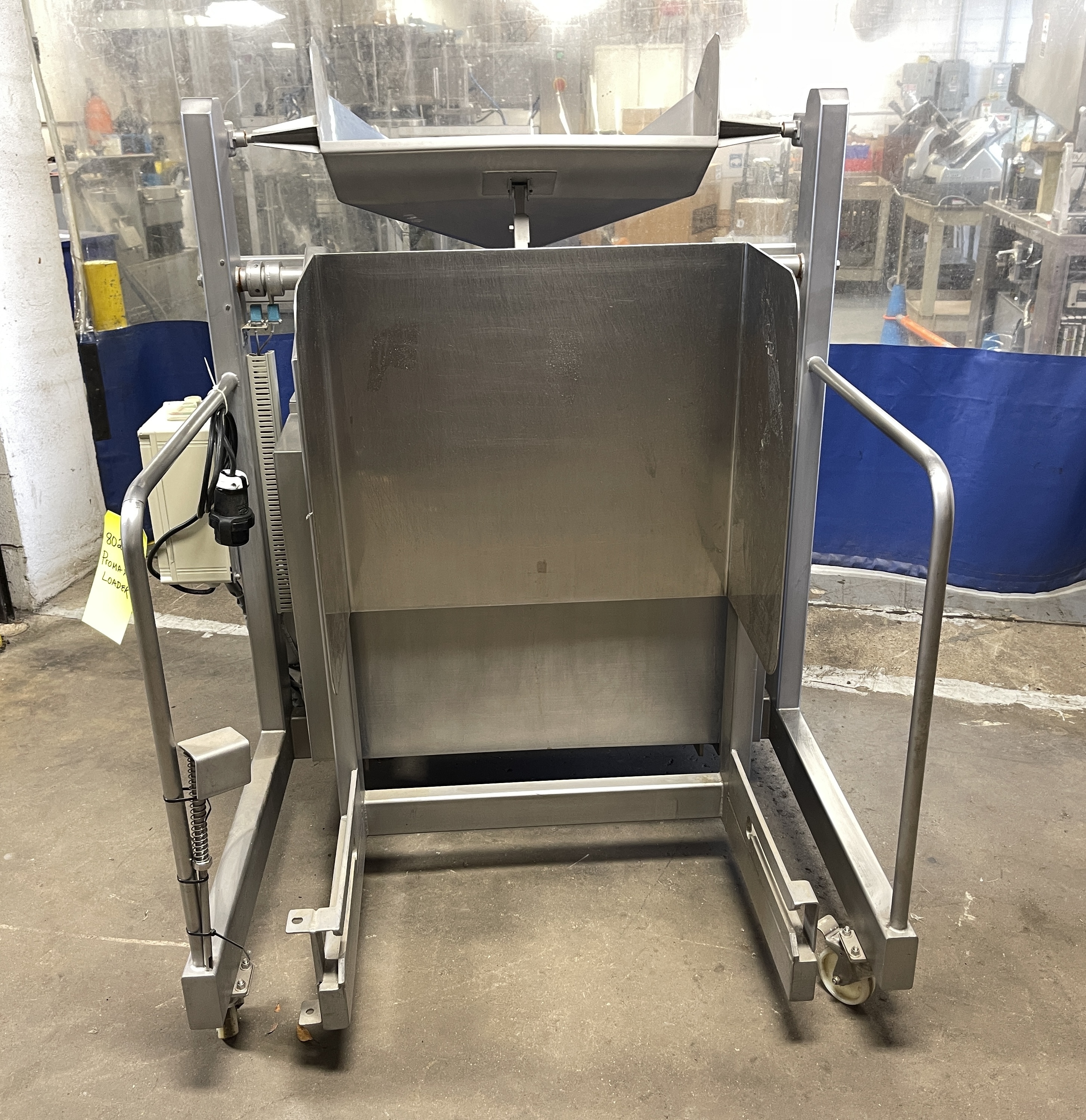 Promarks TM-3000S Vacuum Tumbler. 3,000 Lbs. capacity, (1,360 kg) stainless steel construction, Promarks programmable control panel, Variable speed, reverse discharge function, 4Kw drive motor, 230V/3PH/60HZ. Includes Dump buggy Loader for 400 Lbs. Dump Buggies, self-contained hydraulic unit, portable on casters.