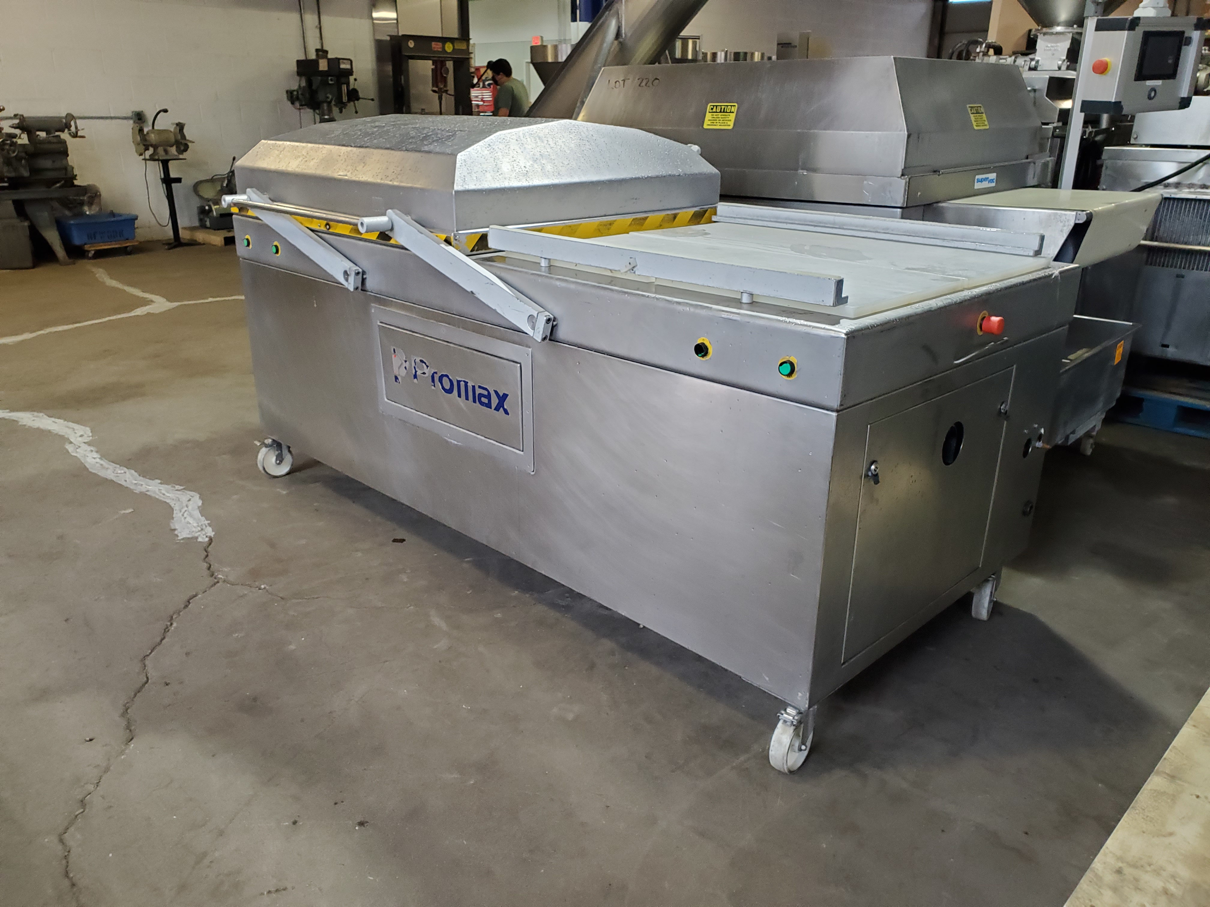 PROMAX DC-900-FB-P-H Chamber Machine. All stainless steel construction, PLC operated, (2) 48″ x 41″ x 12″ chamber, (4) 39.3″ long seal bars with 35″ between seal bars, 10mm wide seal, 12HP self contained vacuum pump, mounted on casters, machine can be run semi-auto or fully automatic, 230V/3PH/60HZ, Requires compressed air to operate lid in both semi or full auto mode.