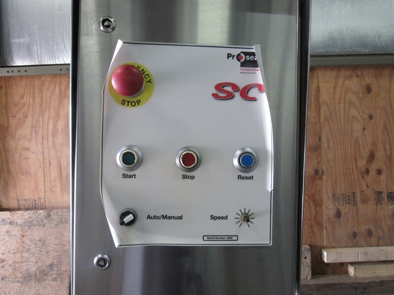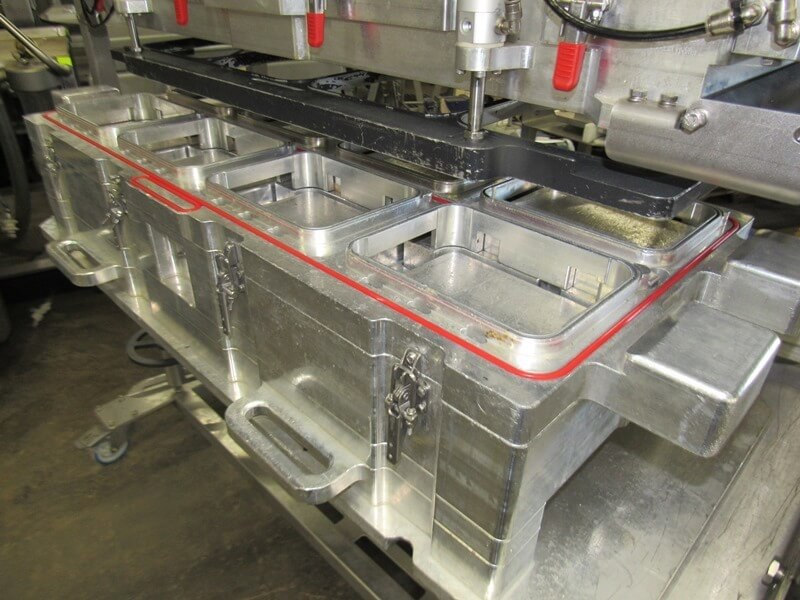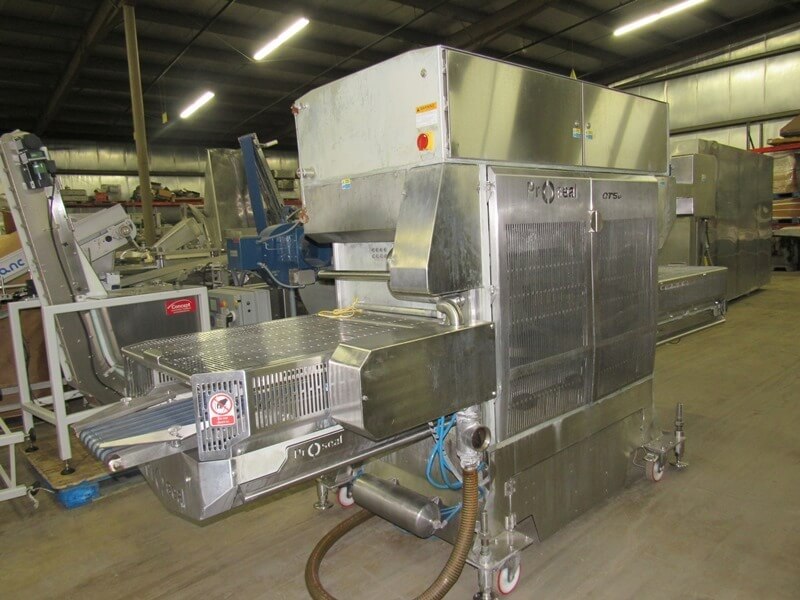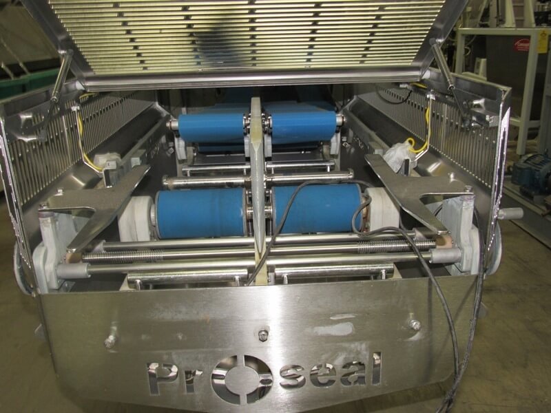 ProSeal GT5e Inline Tray Sealing System. Touch screen controls. Set up as 2 lane MAP vacuum packaging sealer. Includes (4) sets of tooling: (2) 8-up 6″ W X 8″ L & (2) 4-up 6″ WX 15 1/2″ L, 24′ long exit conveyor and spare parts.