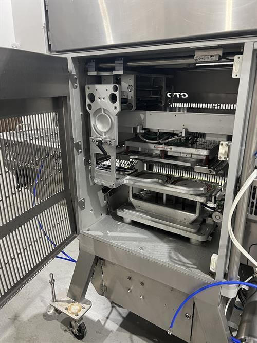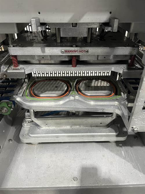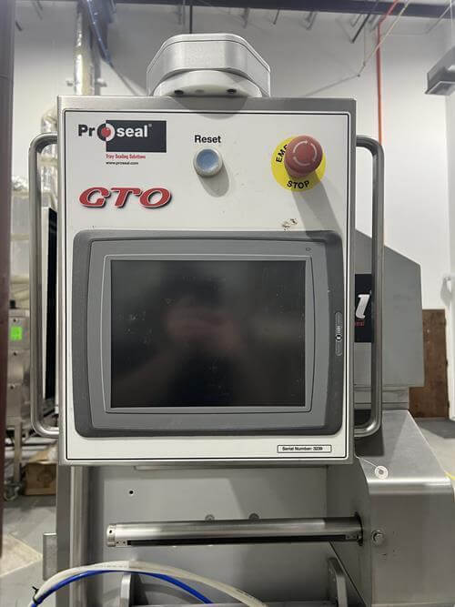 ProSeal GTO In-Line Tray Sealer. Up to 36 atmospheric packs per minute with a 2-impression tool, Two-minute tool changeover, (2) Tray die 8″ x 7.25″, Gas flush. Air requirements: 80 psi @ 2 CFM, 208V/3Ph/60Hz.