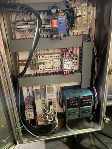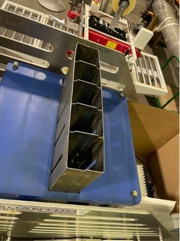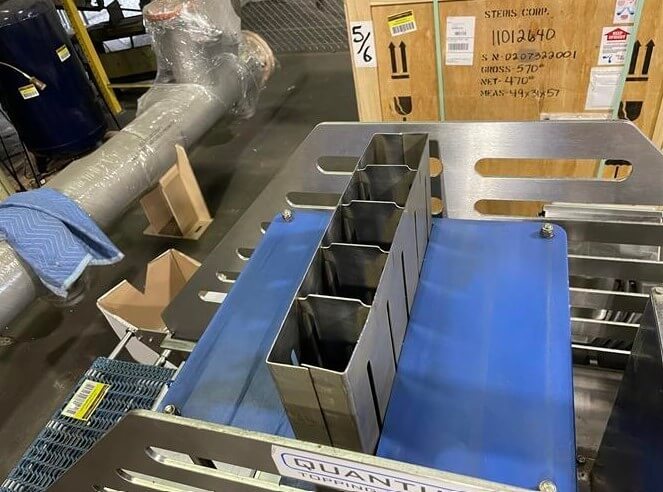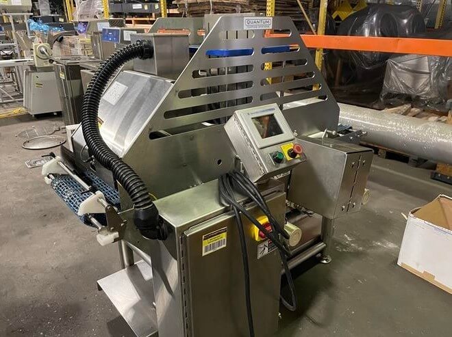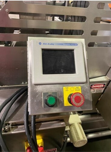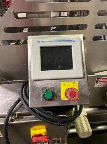 Quantum TP2-0016 Target Pepperoni Slicer. 16″ wide x 72″ long plastic belt conveyor. (5) 2.75″ square product hoppers. Allen Bradley PanelView Plus 600 touchscreen. 220V/3ph/60hz.