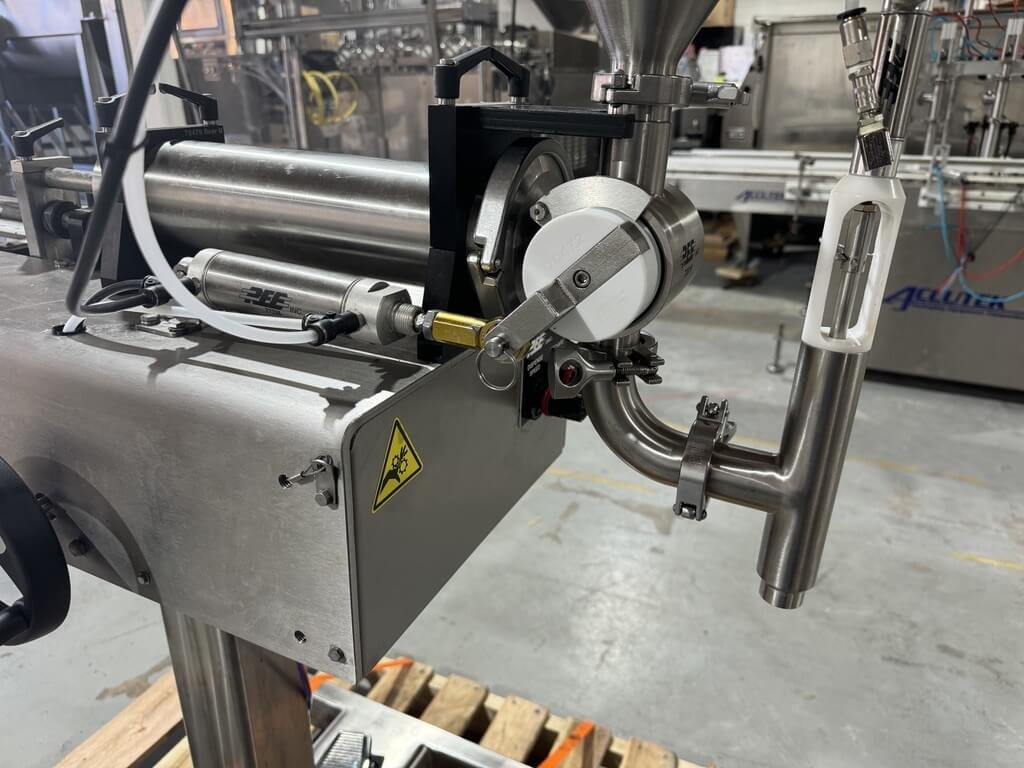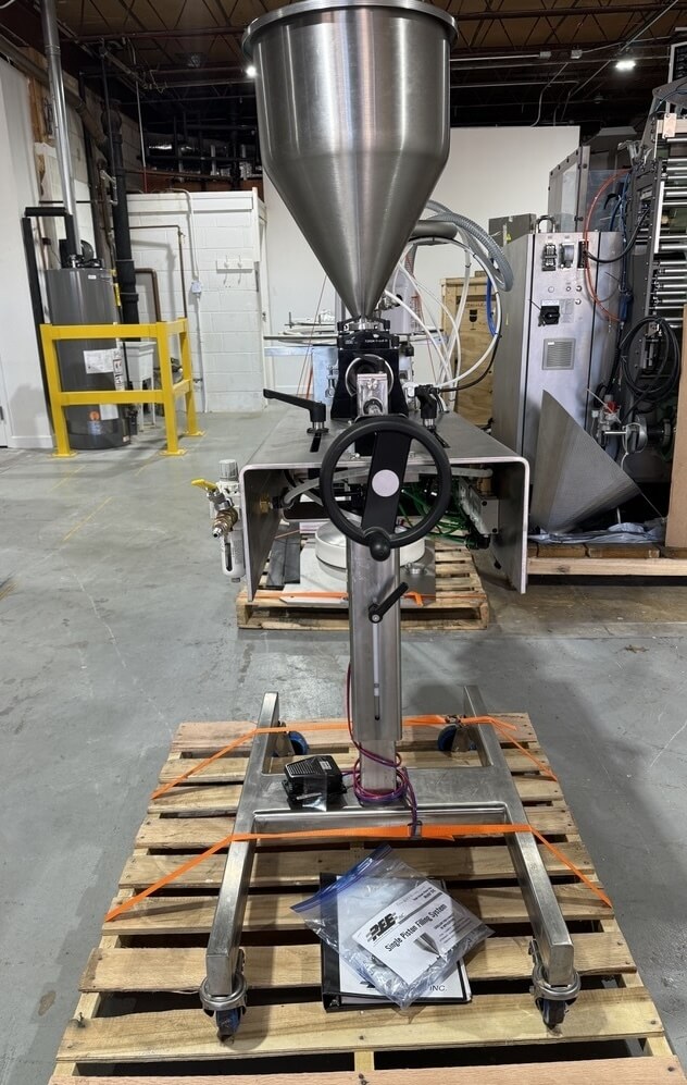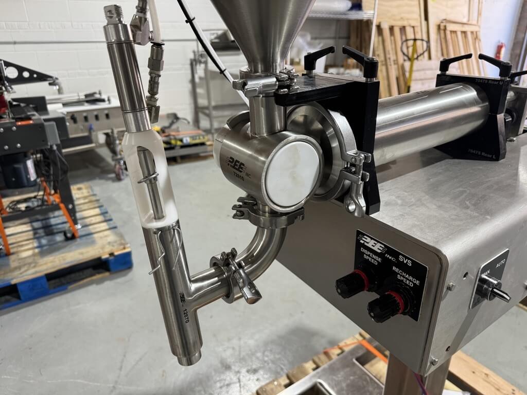 REB SVS Piston Filler. Provides accurate filling and depositing of products including pastes, frostings, gels, sauces, batters, oils and even thin liquids such as solvents.Activated by a foot pedal (in manual mode,) or can run continuously in automatic mode. Includes 3″ product cylinder and 1.5″ exit nozzle.