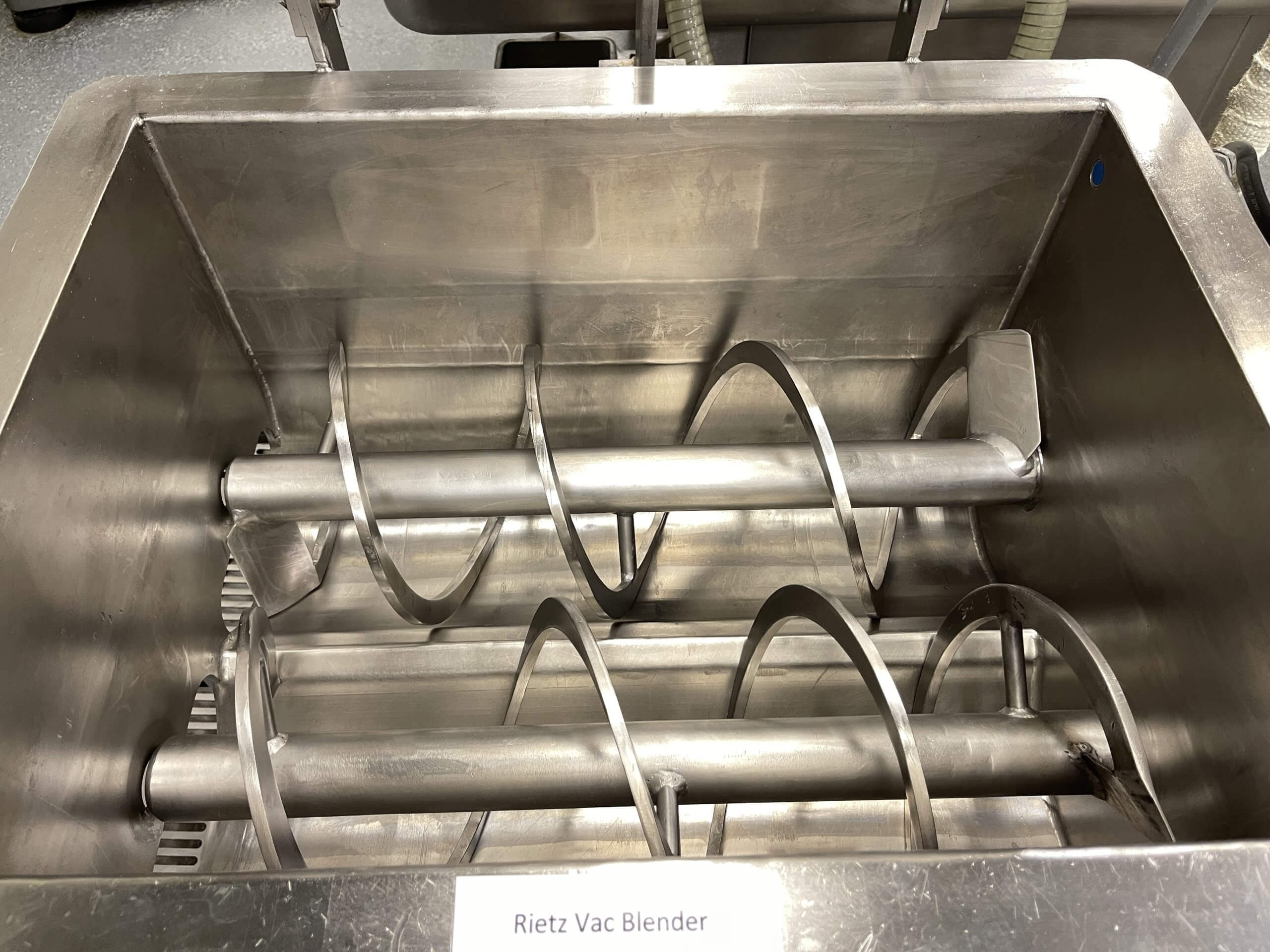 REITZ 200 LBS Vacuum Ribbon Blender. All stainless steel construction, tub dimensions: 38″W x 17″Hx 21″D, approximately 200 Lbs. capacity, dual-end discharge doors, complete with controls, dual 1 hp variable speed US Motor/gearbox, full vacuum pneumatic cover and bottom steam jacket. 480V/3PH/60HZ.