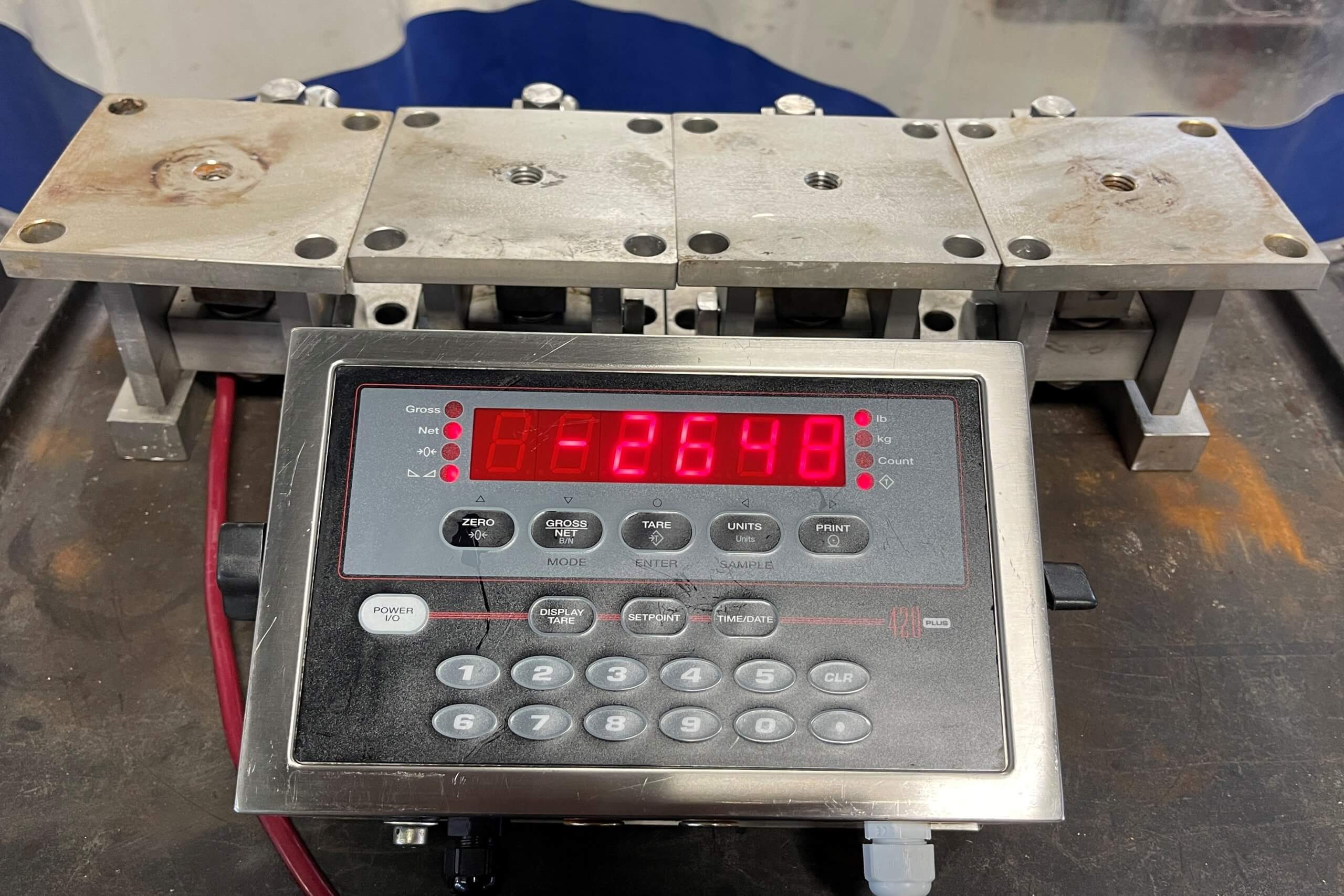 Rice Lake 420 Plus-2R Scale. Load cell system. Includes Digital 420 Plus Read Out, (4) load cells with 5″ x 5″ mounting platforms, 4.5″ X 4.5″ bolt hole pattern, 25′ of cable on each load cell, 110V/1PH/60Hz.