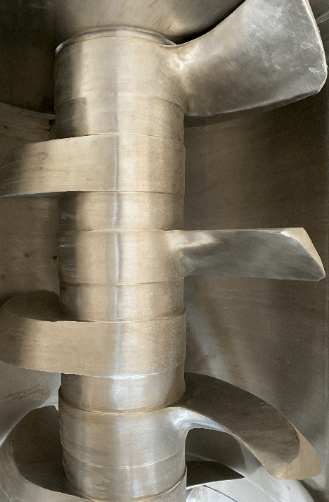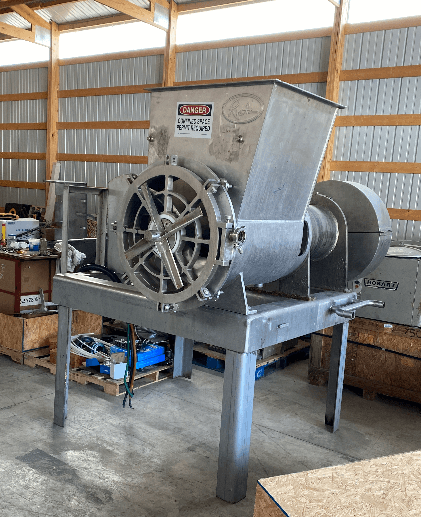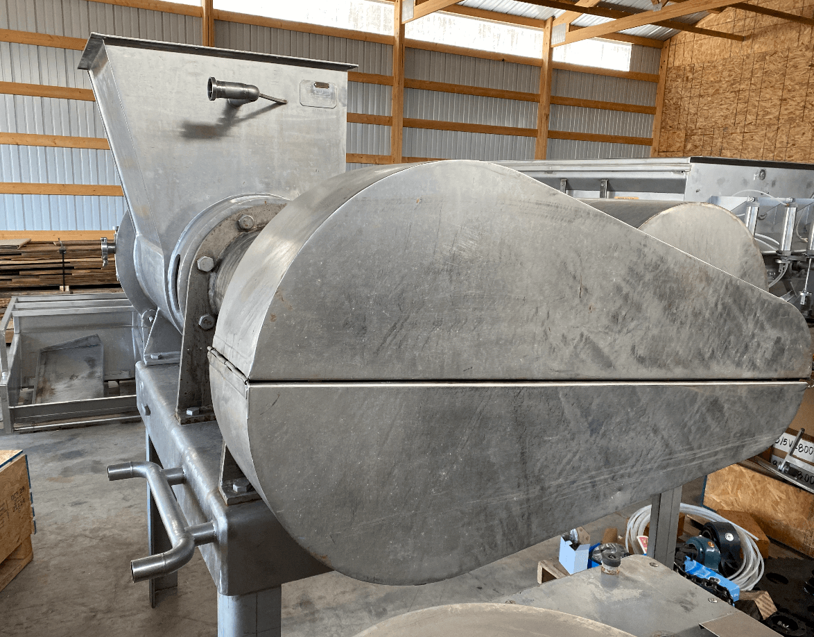 Rietz RE-24 Grinder. Industrial pulverizer machine, engineered with slow speed and high torque for crushing, grinding and tearing large frozen blocks or barrels of materials, such as animal products, meats, cheese, fruits and/or vegetables. 29.5″ wide by 27″ long by 41″ deep cut chamber. 24″ diameter rotor. 16-spoke discharge plate / die plate / extrusion plate. 101″ in-feed & 58.5″ discharge height. All stainless steel construction. 75 HP motor. 460V/3ph/60hz.