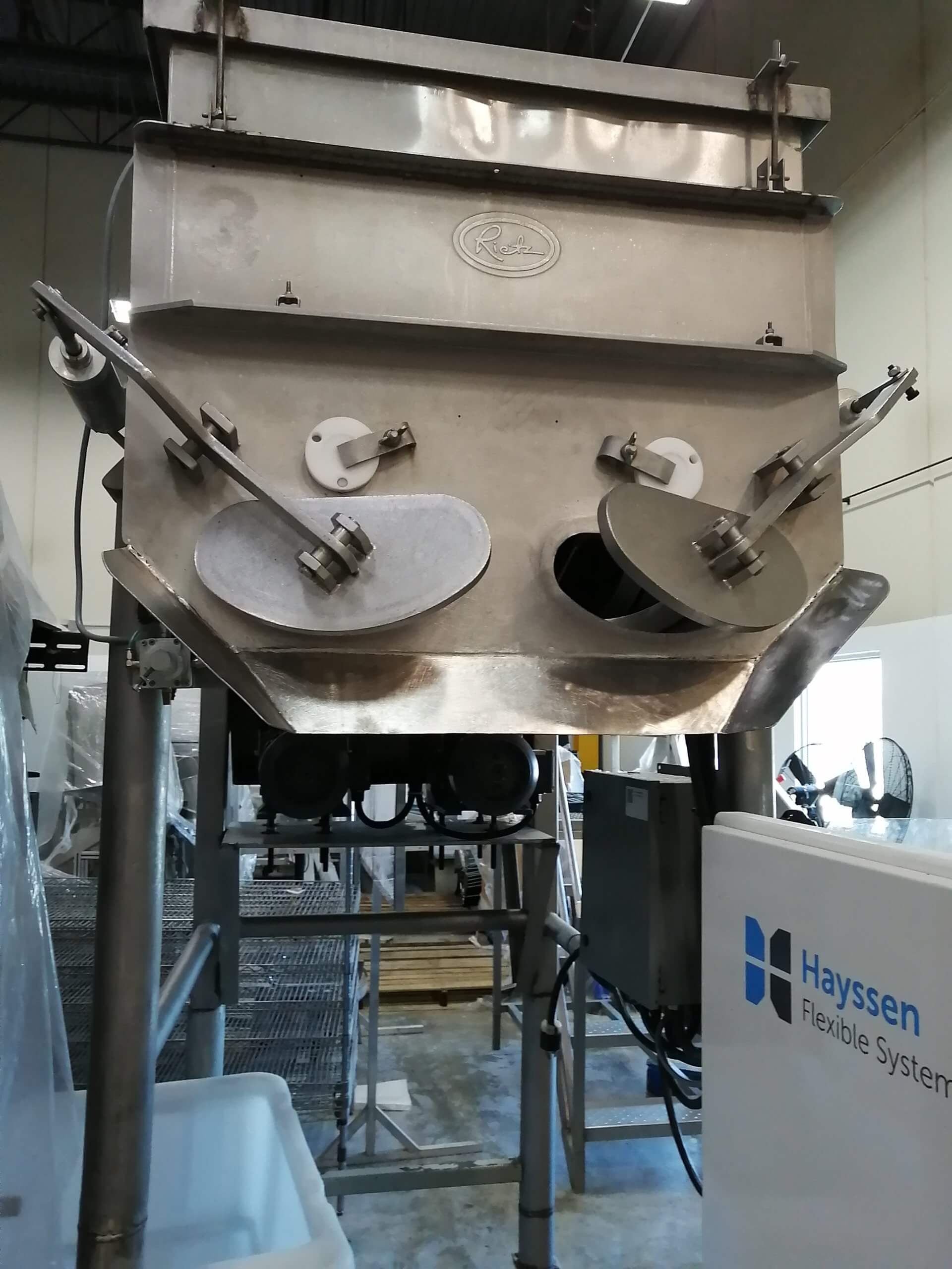 Rietz RS-18-K5405 Mixer. All sanitary stainless steel construction.Vessel inside dimensions of 36″ wide x 48″ long x 26″ deep. (approx 36 cf), Rated at 1,000 Lbs. capacity. (for meat applications), Dual 18″ dia. Ribbon agitation. Dual bottom end pneumatic actuated discharge gates with operator controls. Dual, 5 HP 230/460V/3Ph drive motors.