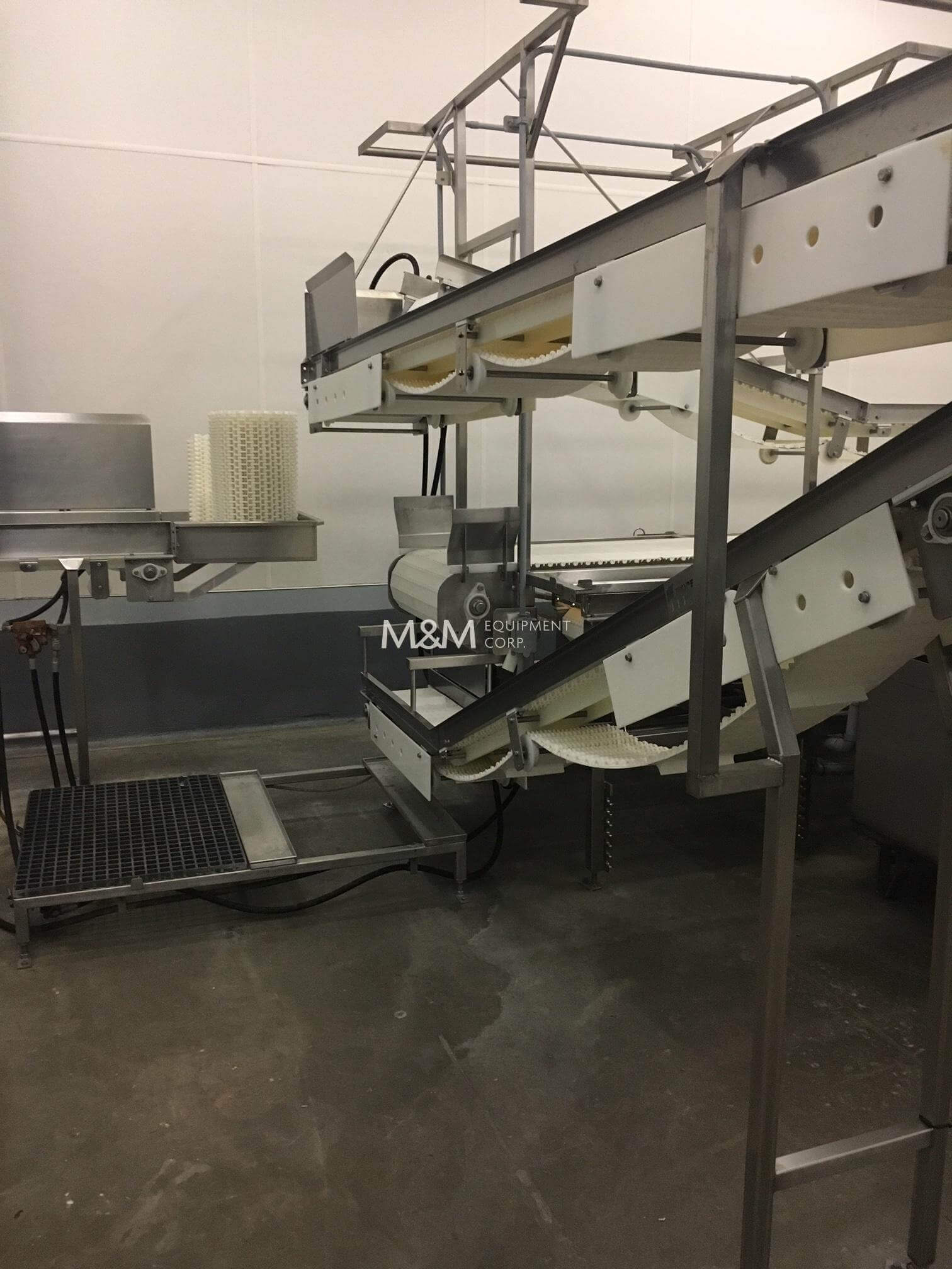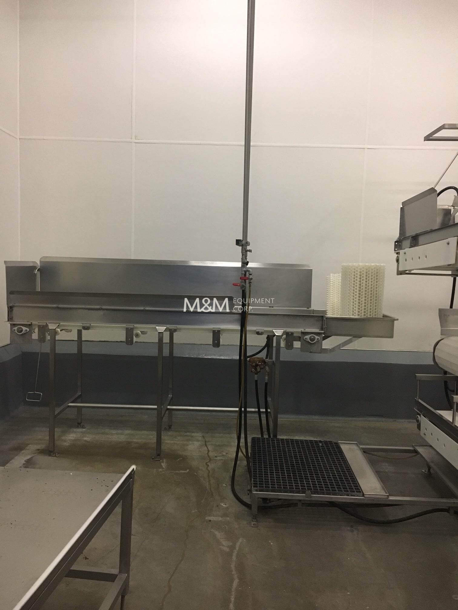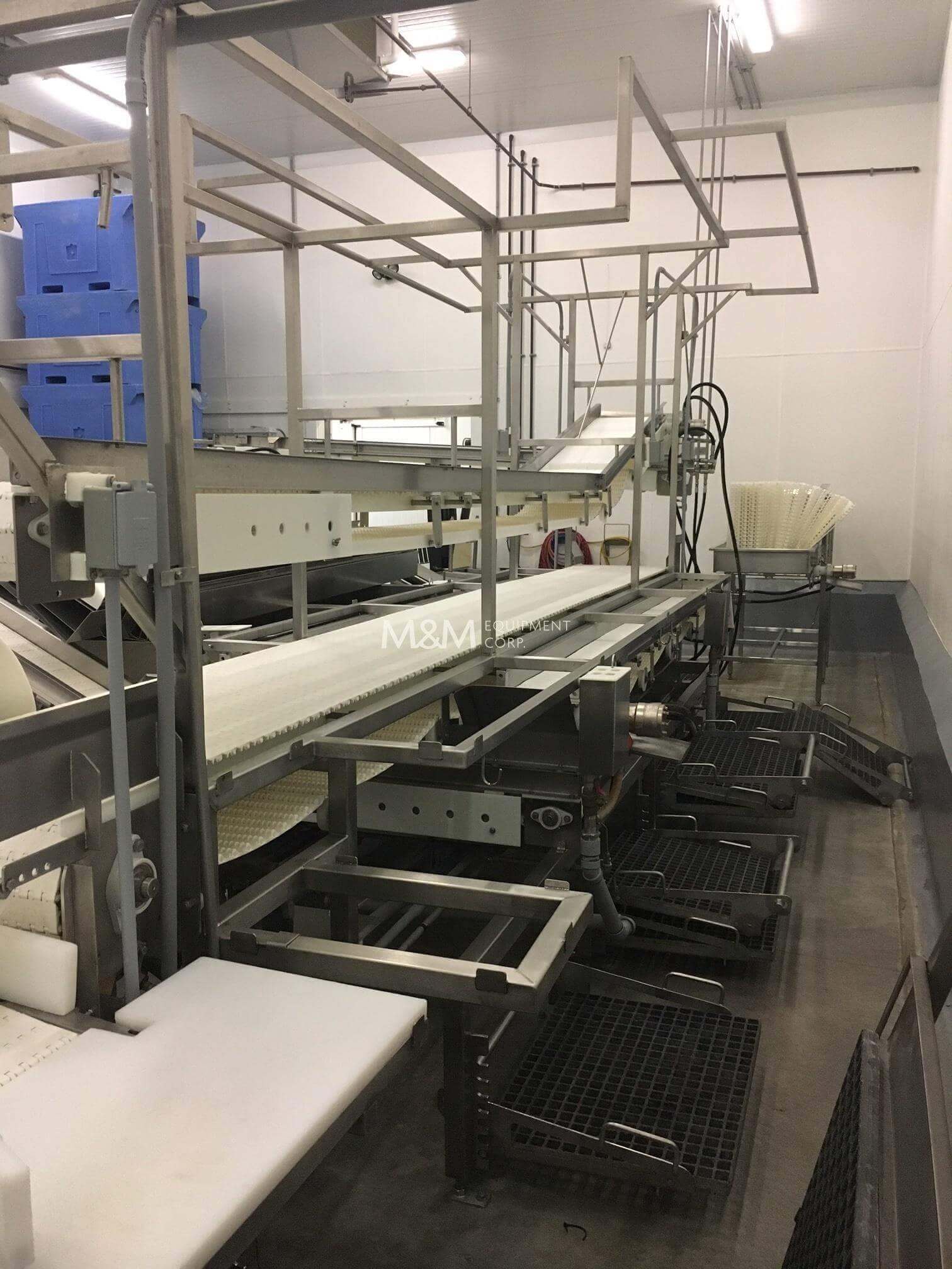 Riopel motorized Cutting Table. 19′ long x 24″ wide center plastic conveyor belt. 18″ cutting boards. 8″ wide under board trim conveyors on each side. 16″ wide overhead trim conveyor that transfers to a 11″ wide transfer conveyor. 10″ wide incline transfer conveyor for fat, trim or bones. Hydraulic drive motors through out. All stainless steel construction.