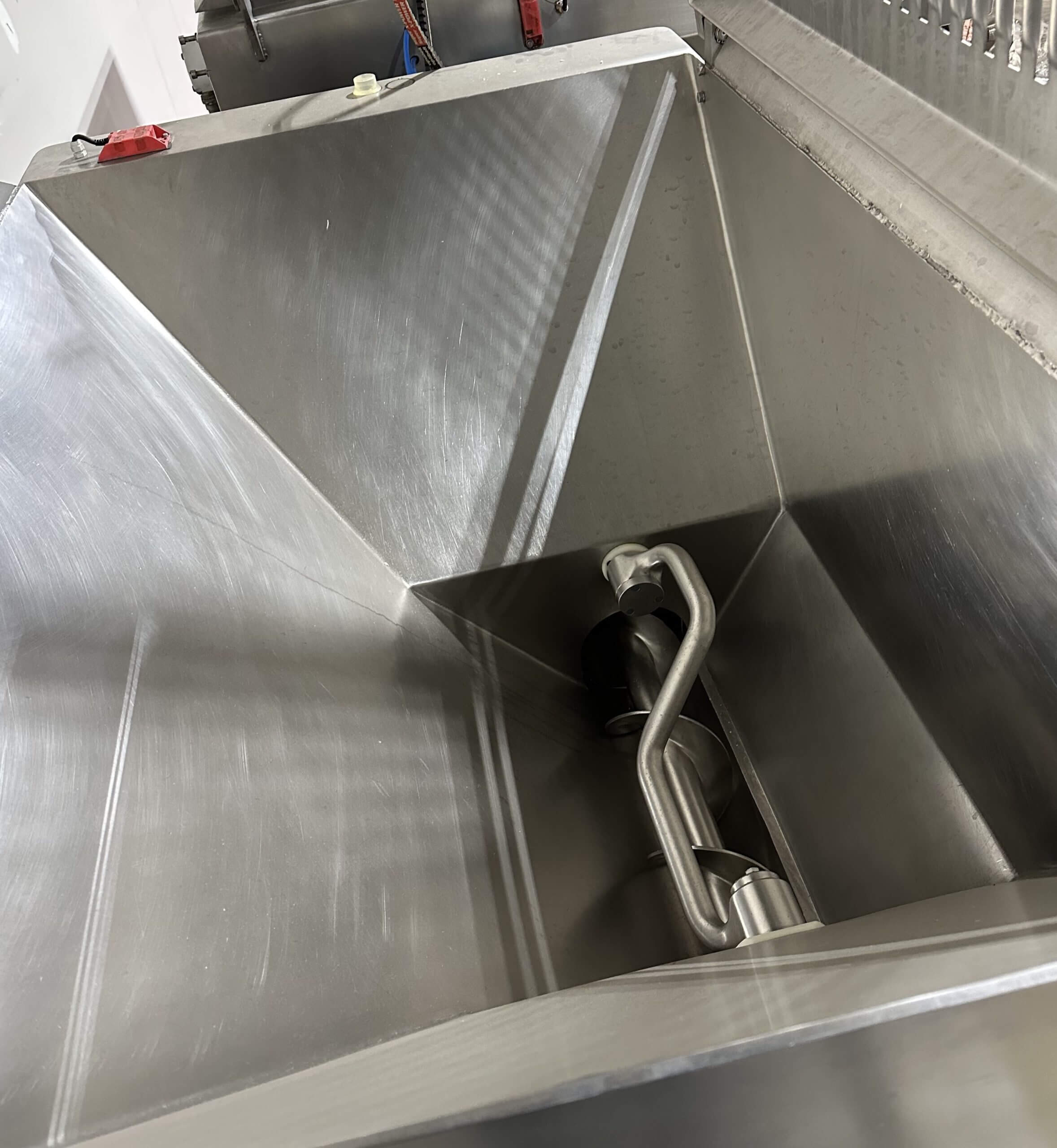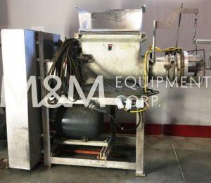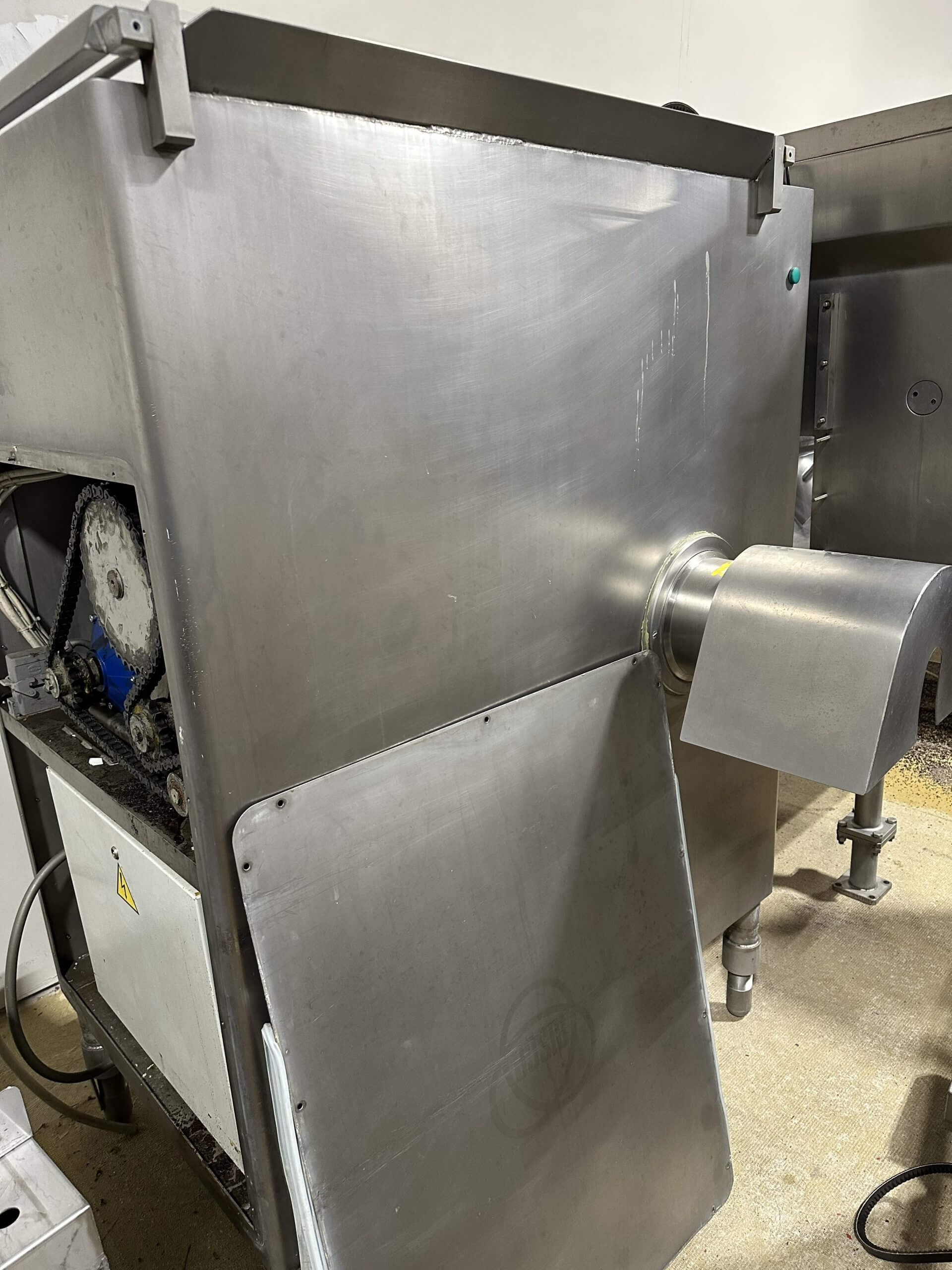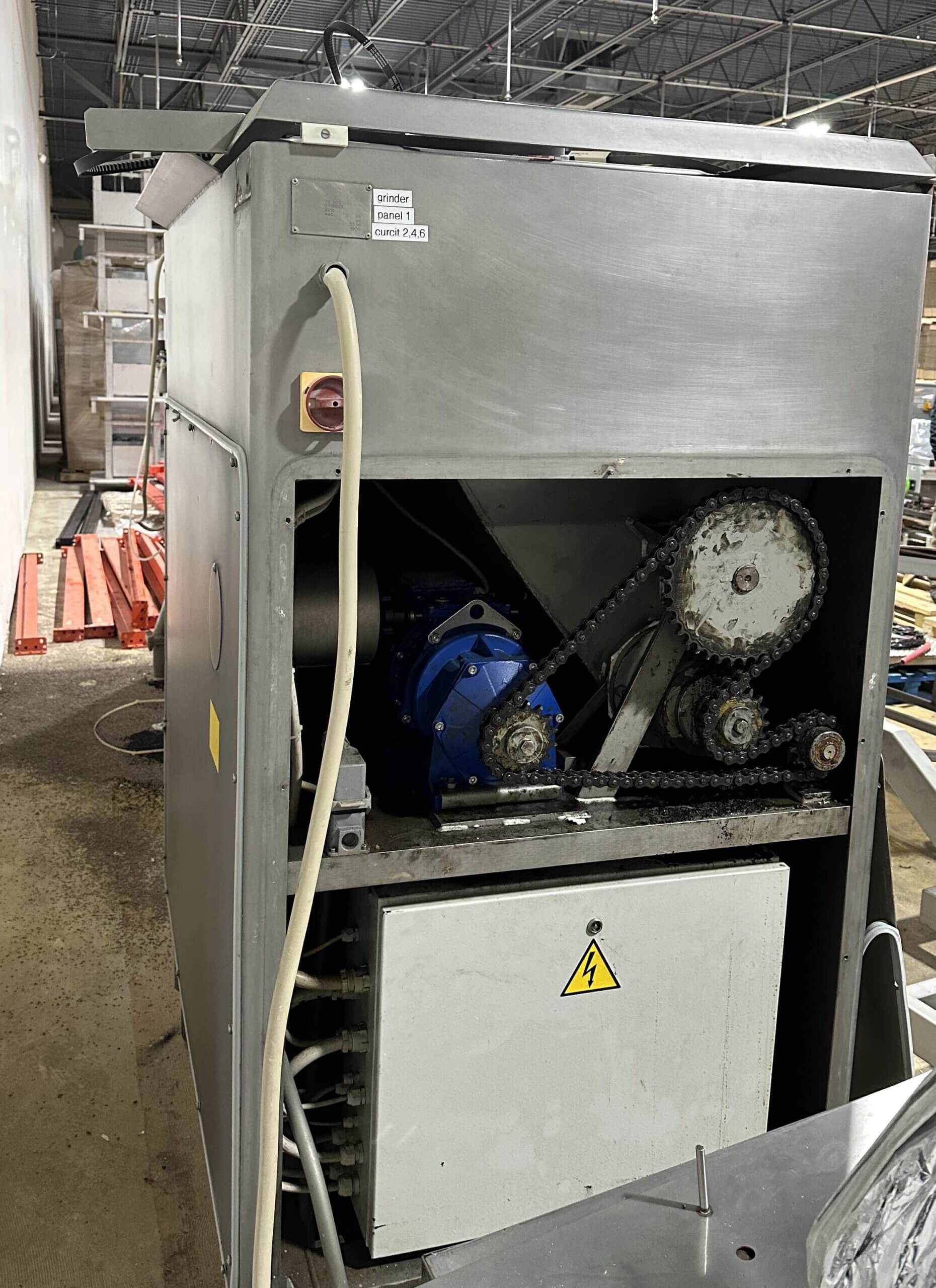 Risco TR 200 Automatic Angle Grinder. 200mm grind plate and knife, The feeding system consists of a mixing arm that conveys the product to the feeding auger located at the bottom of the bowl. Product is continuously pushed towards the grinding auger, which is placed at a 90° angle to the feeding auger. 650 Lbs. (325 liter) hopper capacity, 460V/3Ph/60Hz.