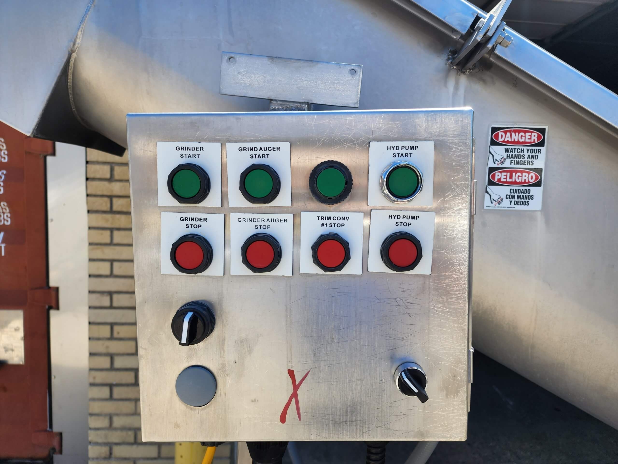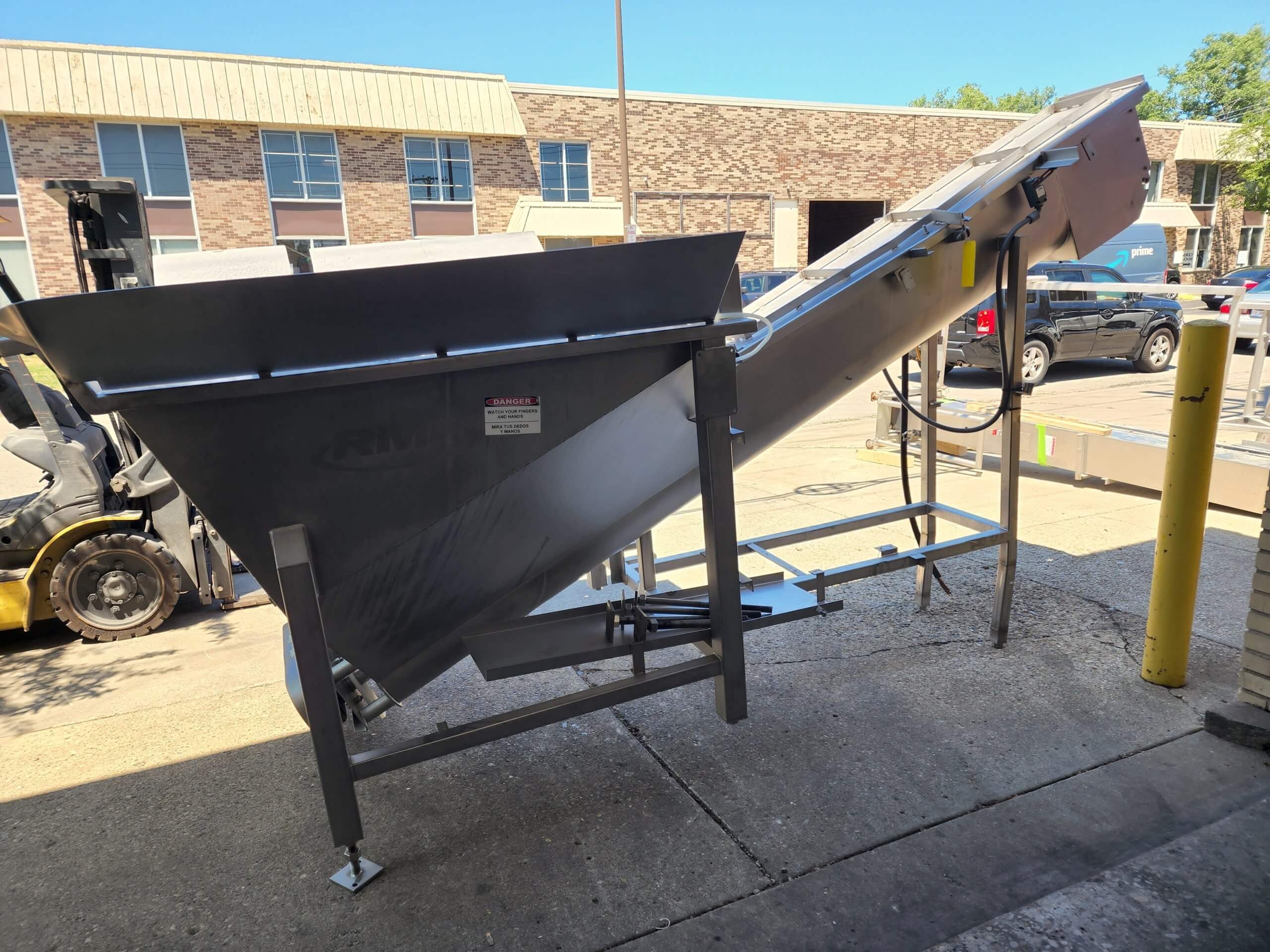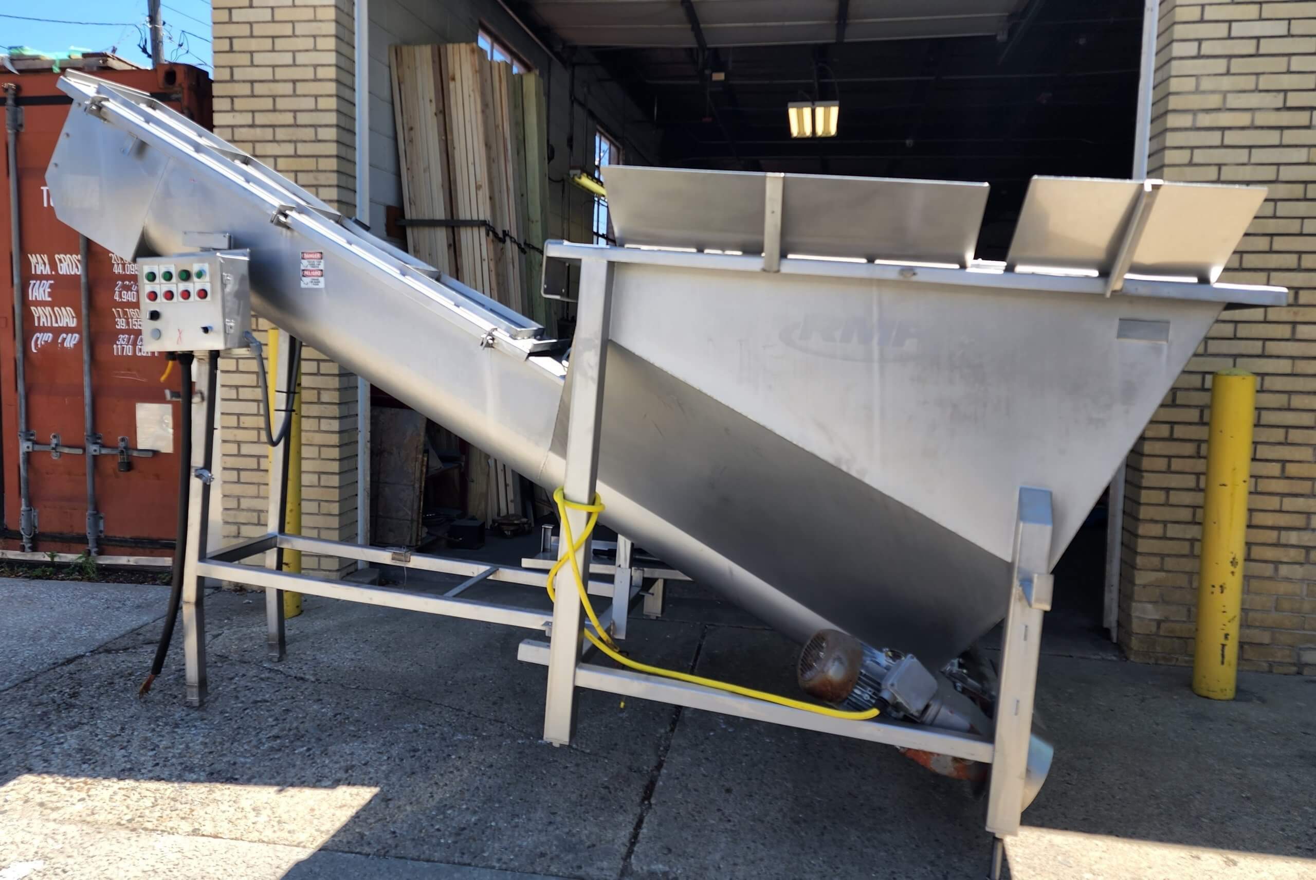 RMF SCA1210 Conveyor. Stainless steel construction. Full safety covers, 12″ x 10′ long bottom feed auger, 59″ x 61″ x 58″ deep hopper, full safety covers and hopper grate. 5hp chain drive gearmotor, 1700 RPM, 440V/3PH/60Hz.