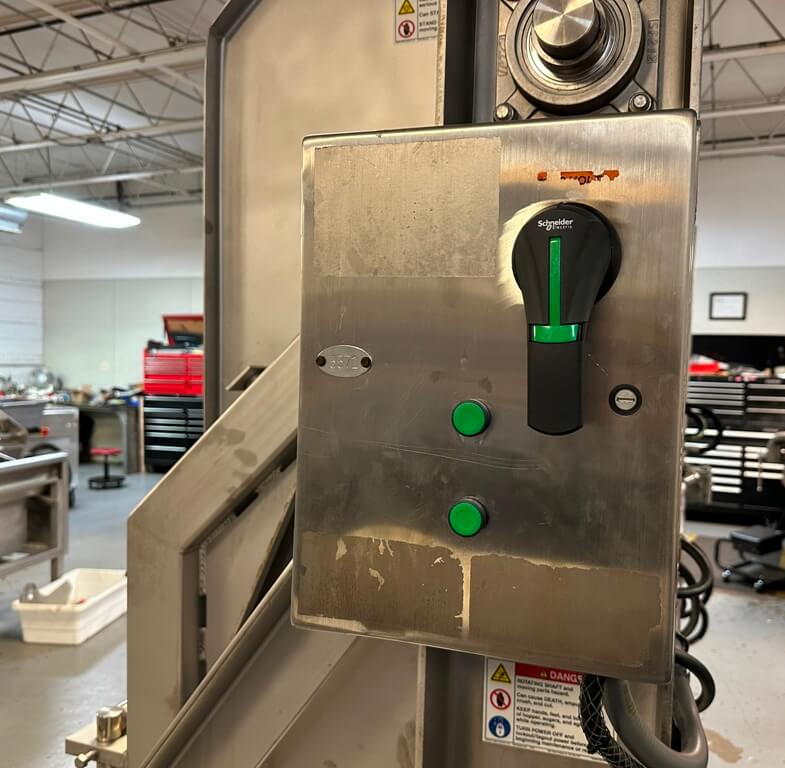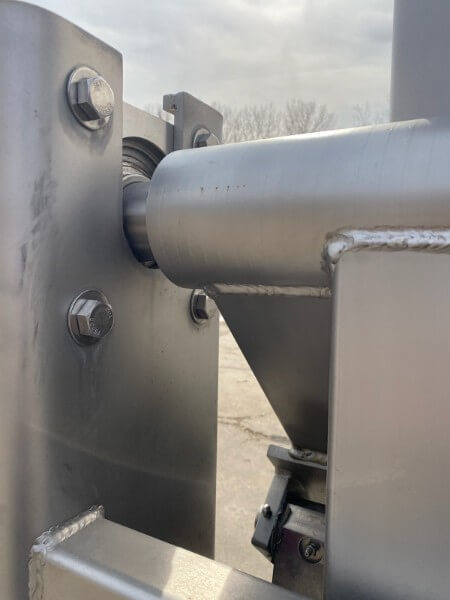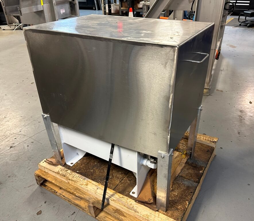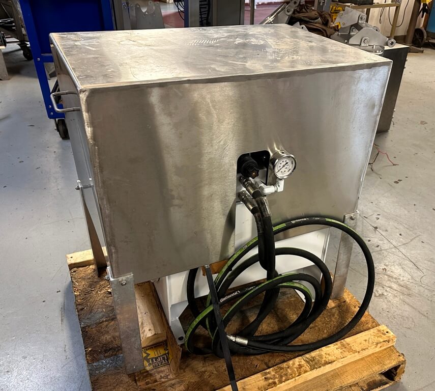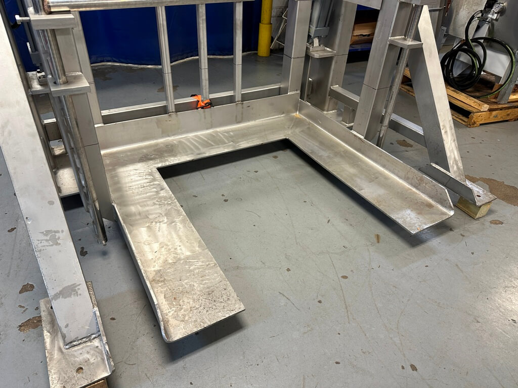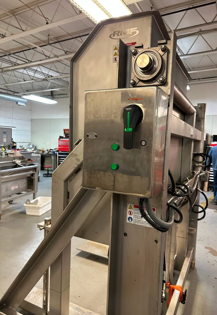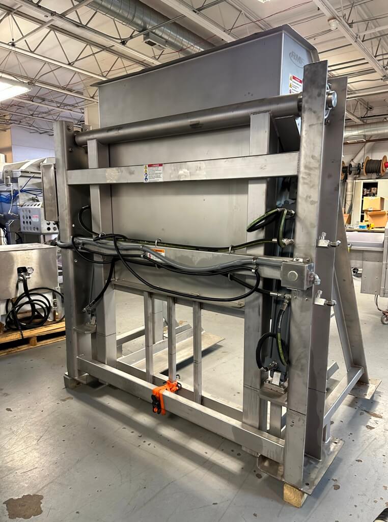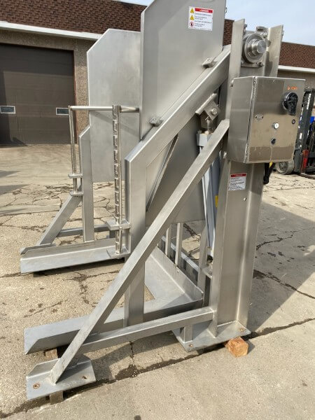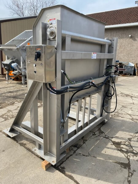 Used RMF Vat Dumper, all stainless steel construction, 70″ pivot point, 53″ wide x 48″ deep bed, adjustable hold down bars from 30″ to 57″, 2,500 Lb. lift capacity, dual hydraulic lift cylinders, OD: 7′ x 5′ x 7′. Includes a 5HP hydraulic power pack, 460V/3PH/60HZ.