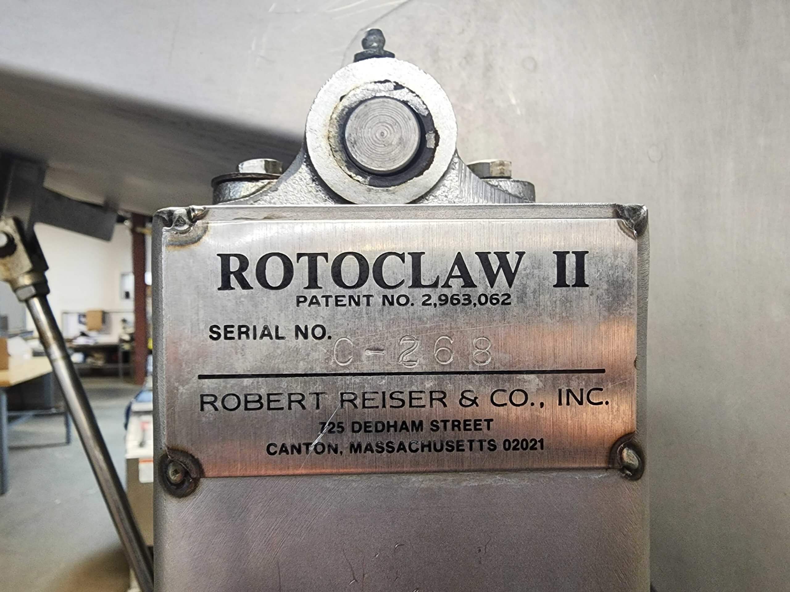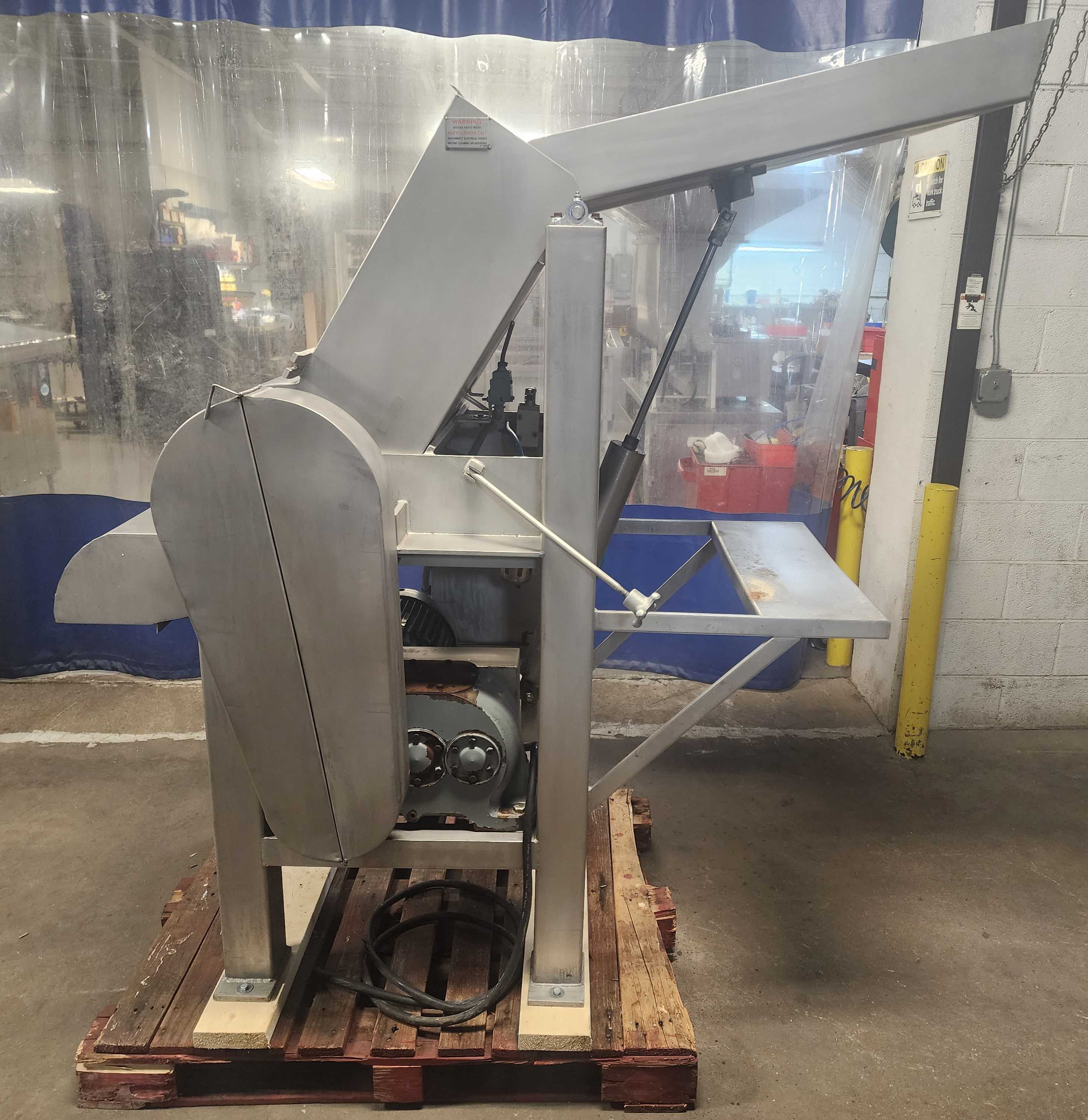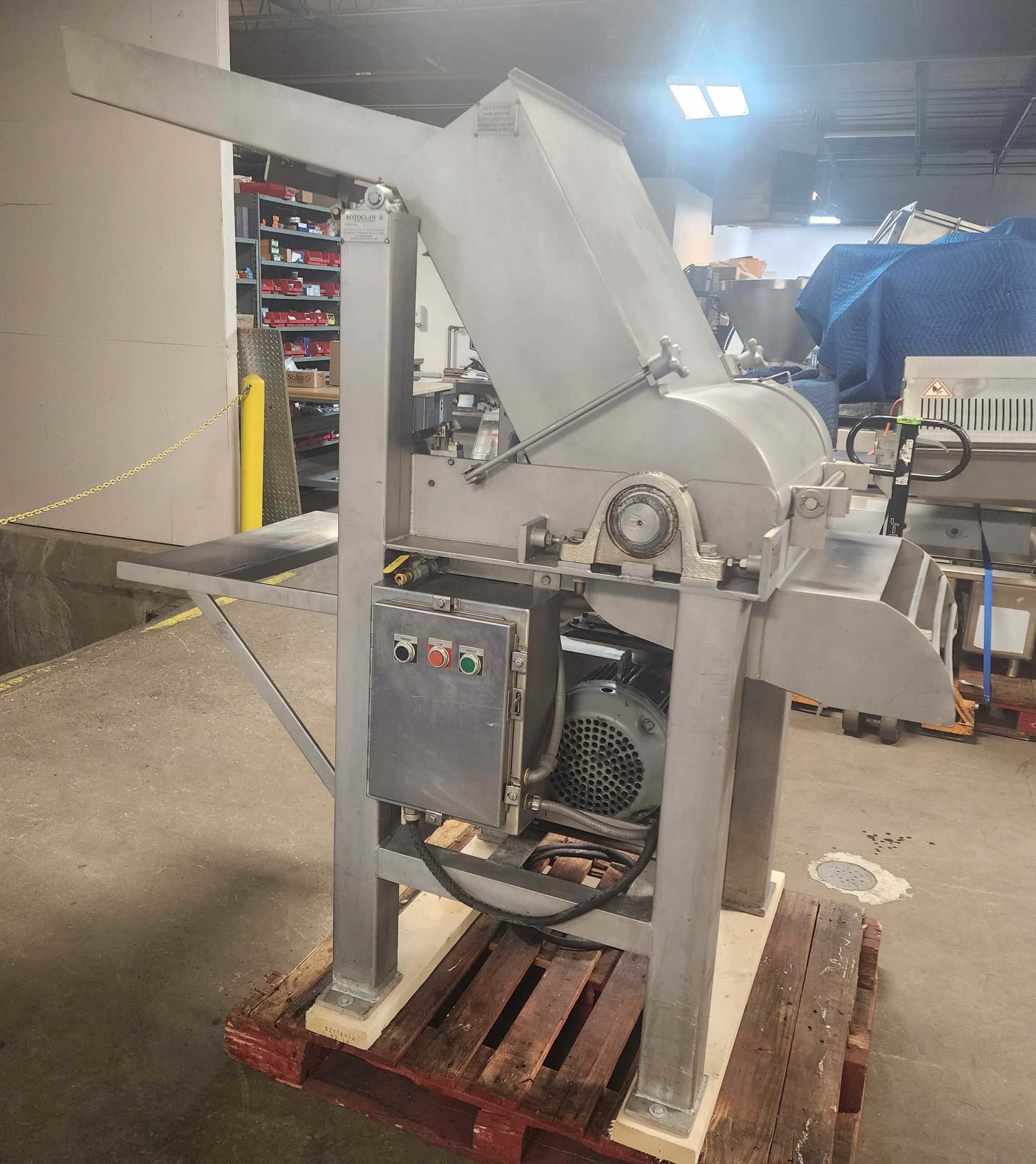 Robert Reiser Rotoclaw II Frozen Meat Flaker. All stainless steel construction. Handles frozen blocks up to 9.5″ x 21″, capacity up to 10,000 Lbs./hour. 7.5 hp motor, 220/440V3PH/60HZ. Built-in loader, requires 80 PSI compressed air.