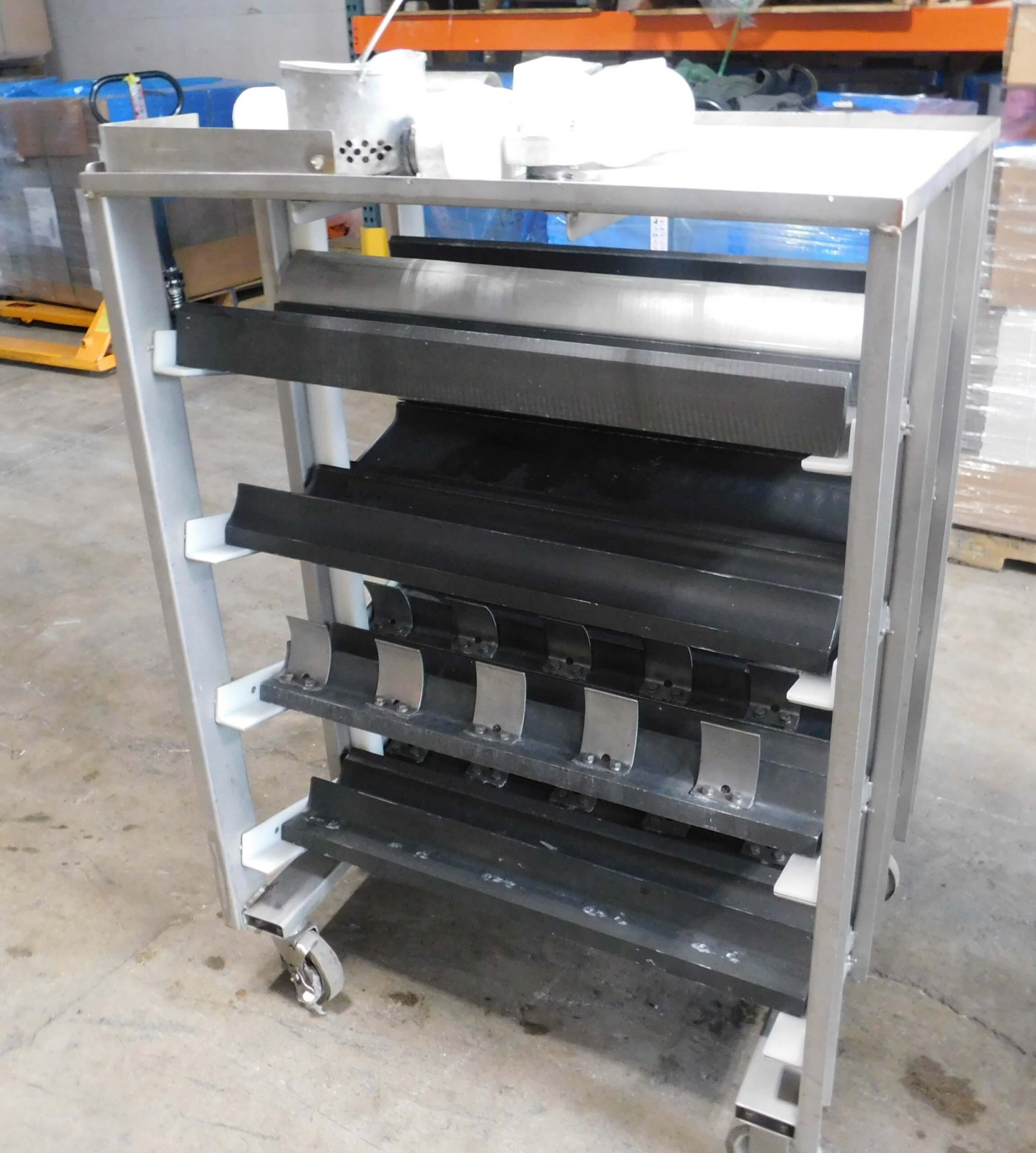 ROSS 914-E Meat Press Machine. Uniformly shapes tempered and crust-frozen products. Extended mold cavity of 32″ X 5″ X 10″. Dwell range: 3-10 seconds. Up to 6 cycles per minute. Includes portable Mold rack with (4) sets of molds. Self-contained hydraulic power unit adjustable pressure to 1500 PSI. 220/3Ph/60Hz, 40 Amps.