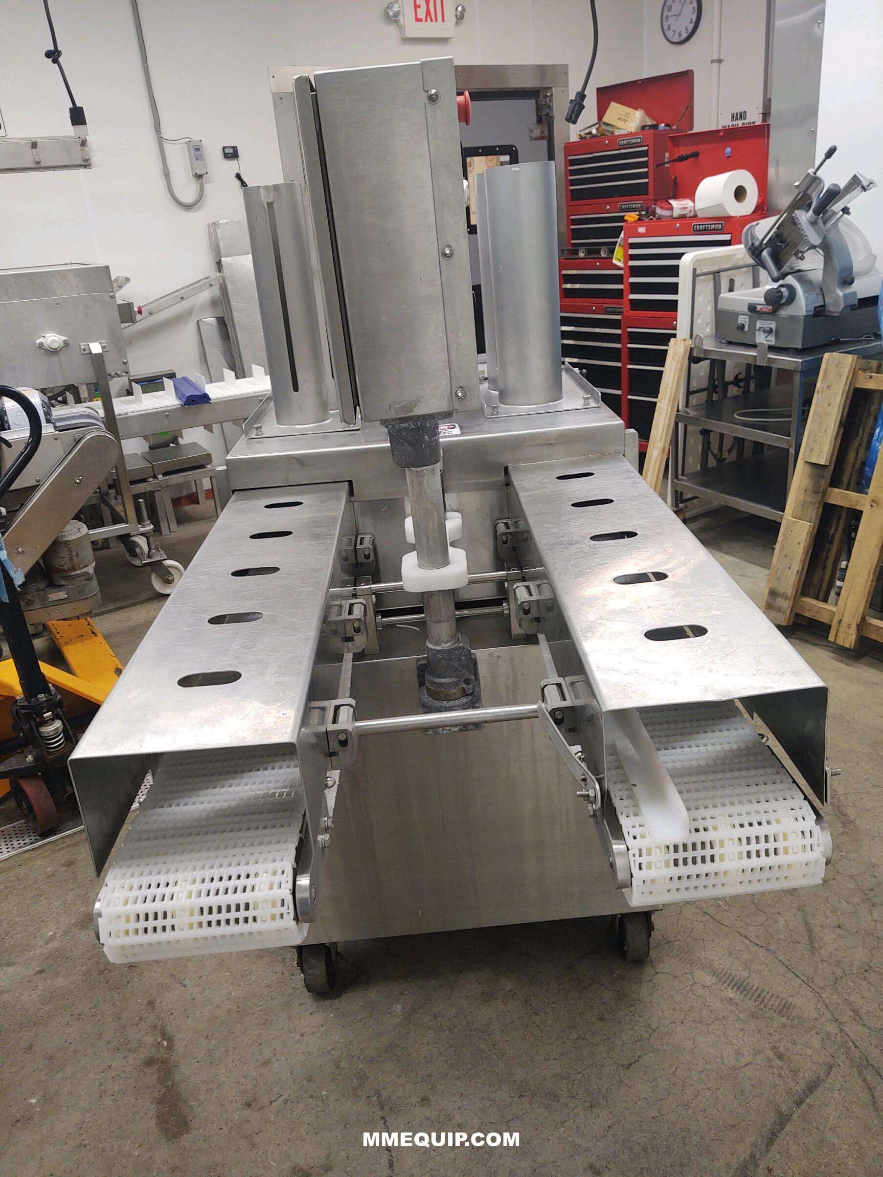 Ross 950-8 Slicer. Stainless steel construction. (2) 7″ wide discharge conveyors with plastic belting. Capable of slicing up to 100 slices per minute (per chute). Slice thickness 0.25″ to 1.5″, Ideal product temperature range is 25-29 degrees F. 220V/3PH/60HZ.