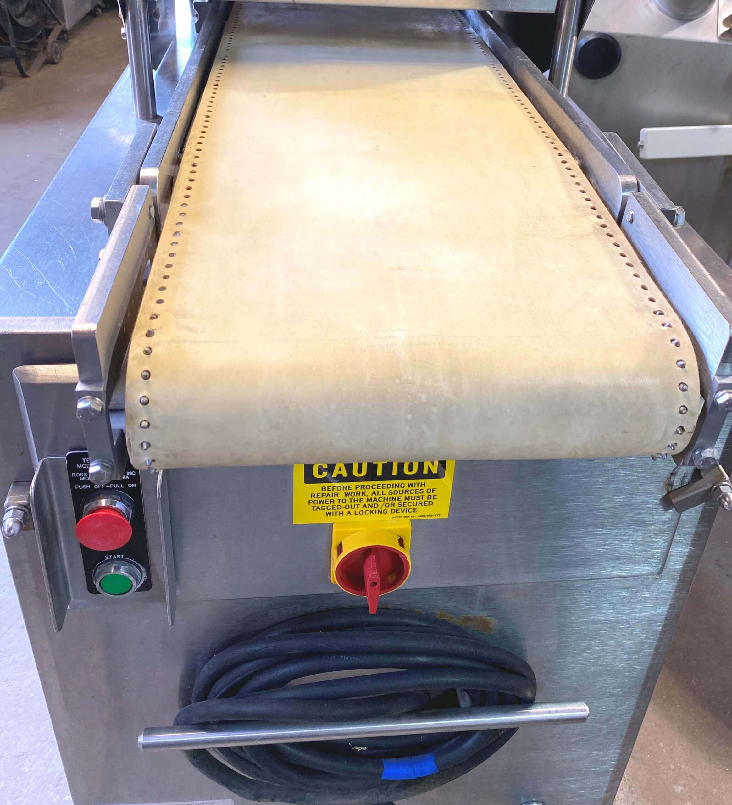 Ross Flattener and Tenderizer. 448 stainless steel tenderizing needles. 2″ maximum product height for boneless meat & poultry. Magnetic head design. Production rate up to 1,000#/hr., conveyor speed 5.5 ft/minute, 12″ wide neoprene conveyor belt, 5 hp drive motor. 240V/3PH/60Hz,15 AMPS.