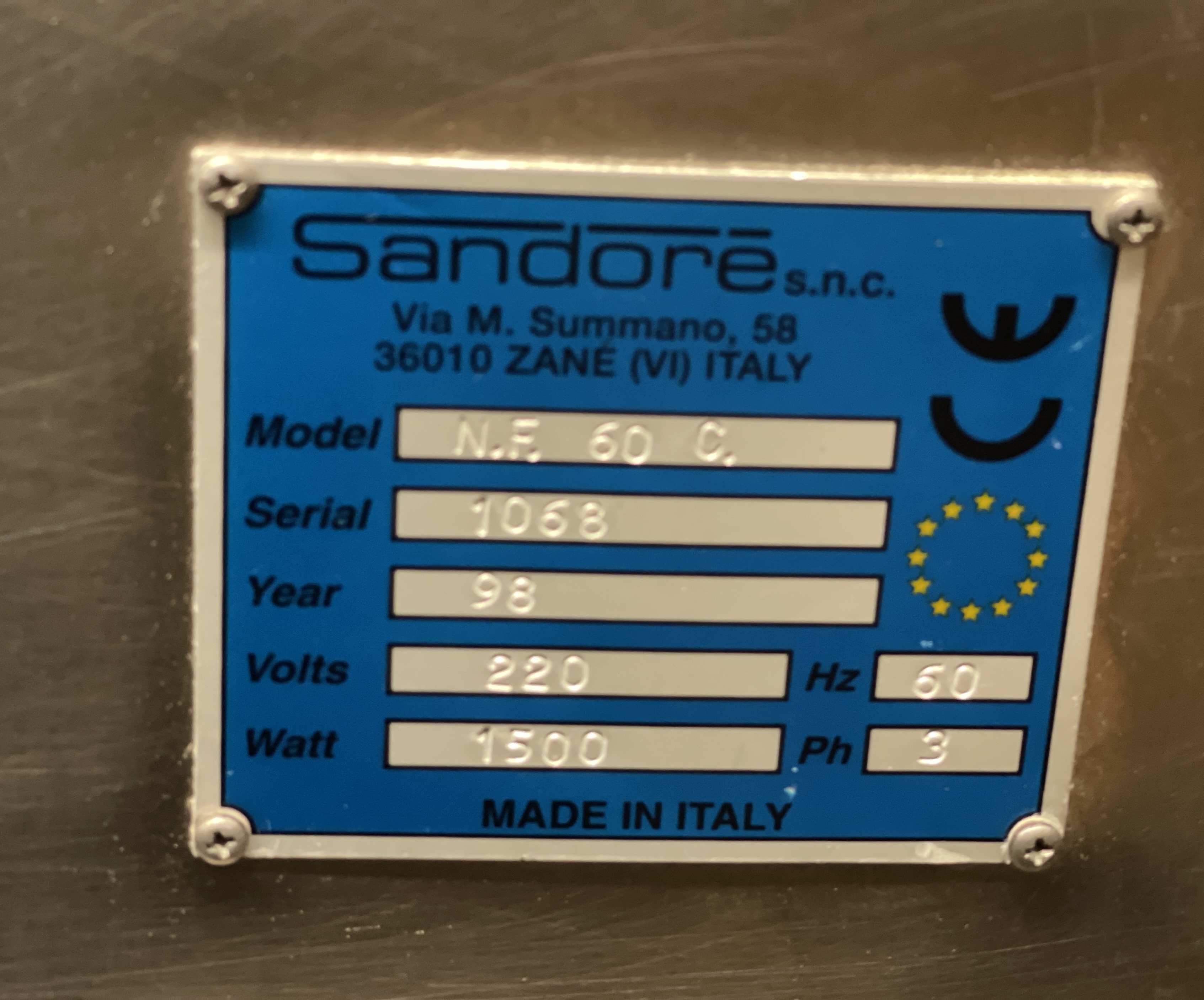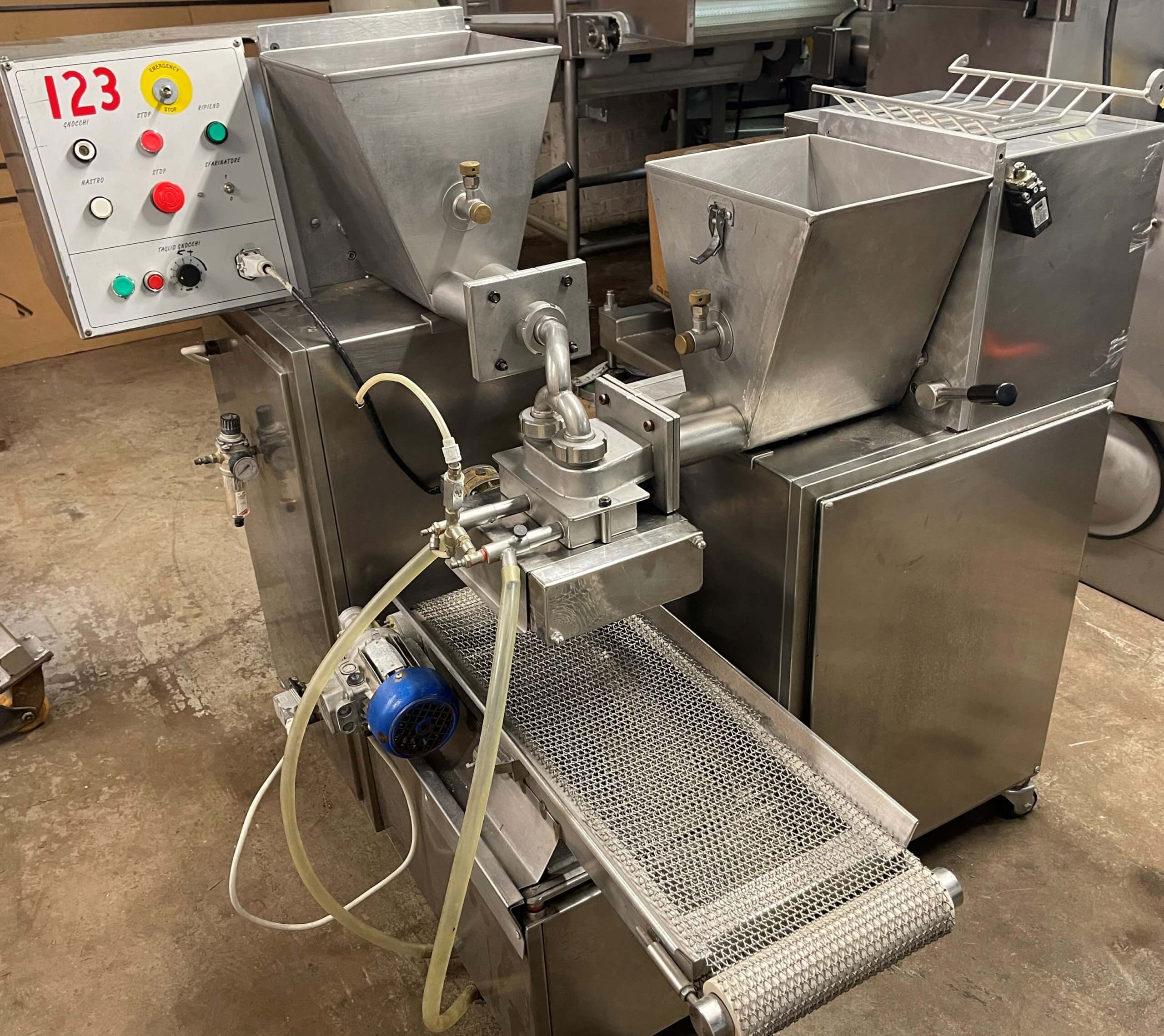 Sandore NF 60 C Gnocchi Former. Twin screw extrusion, cuts 120 to 180 pcs./minute, maximum output 7,000 to 12,000 pieces/hour. stainless steel construction, 220V/3PH/60HZ.