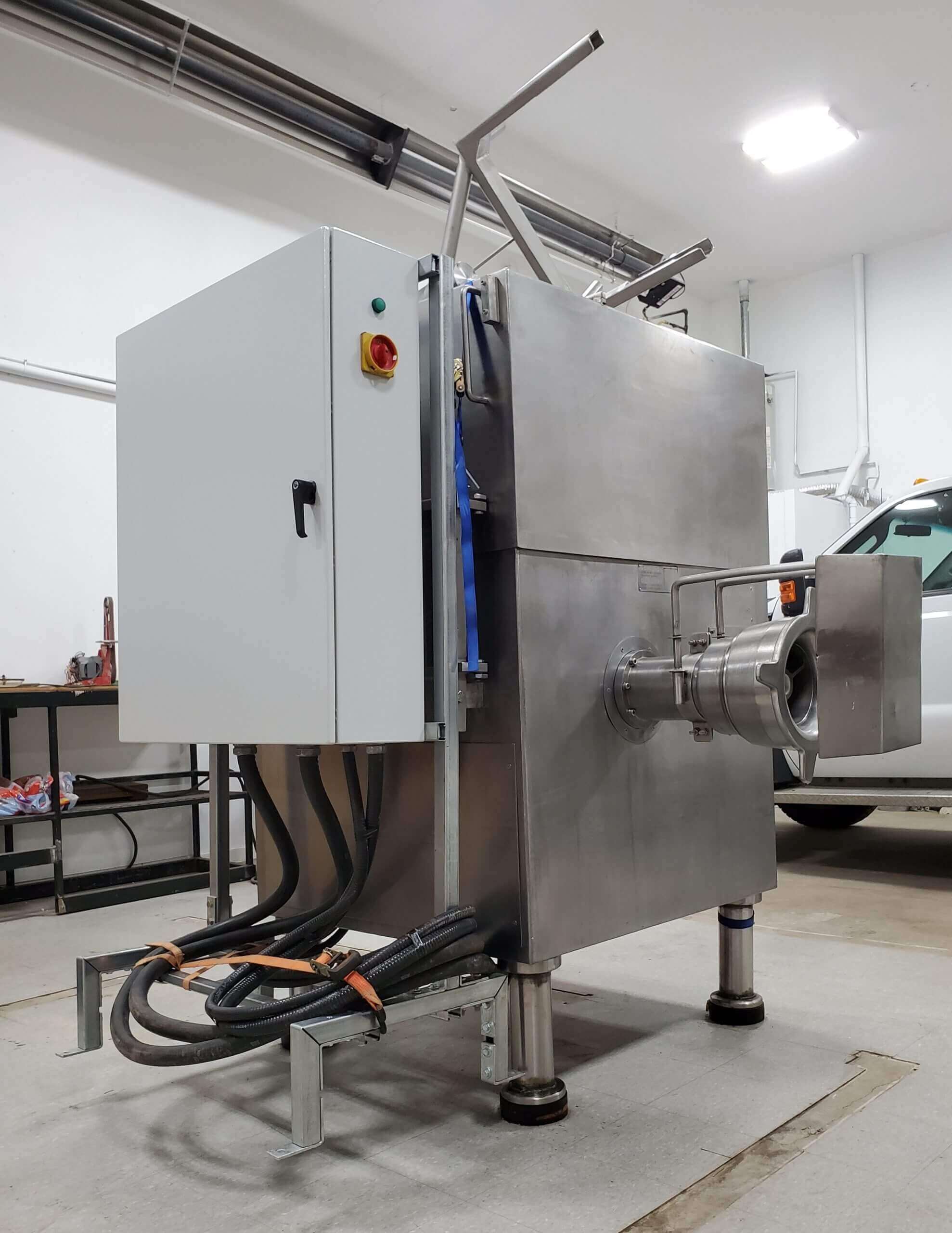 Seydelmann Automatic Feed Grinder. 200mm hole plate diameter. Stainless steel construction. Adaptors for single or double cut. 300 liter hopper, two speed working Grind motor. Hourly out put up to 13,000 lbs. per hour. Attached Dump Buggy loader. External control panel. 74 hp motor, 208V/3PH/60HZ.
