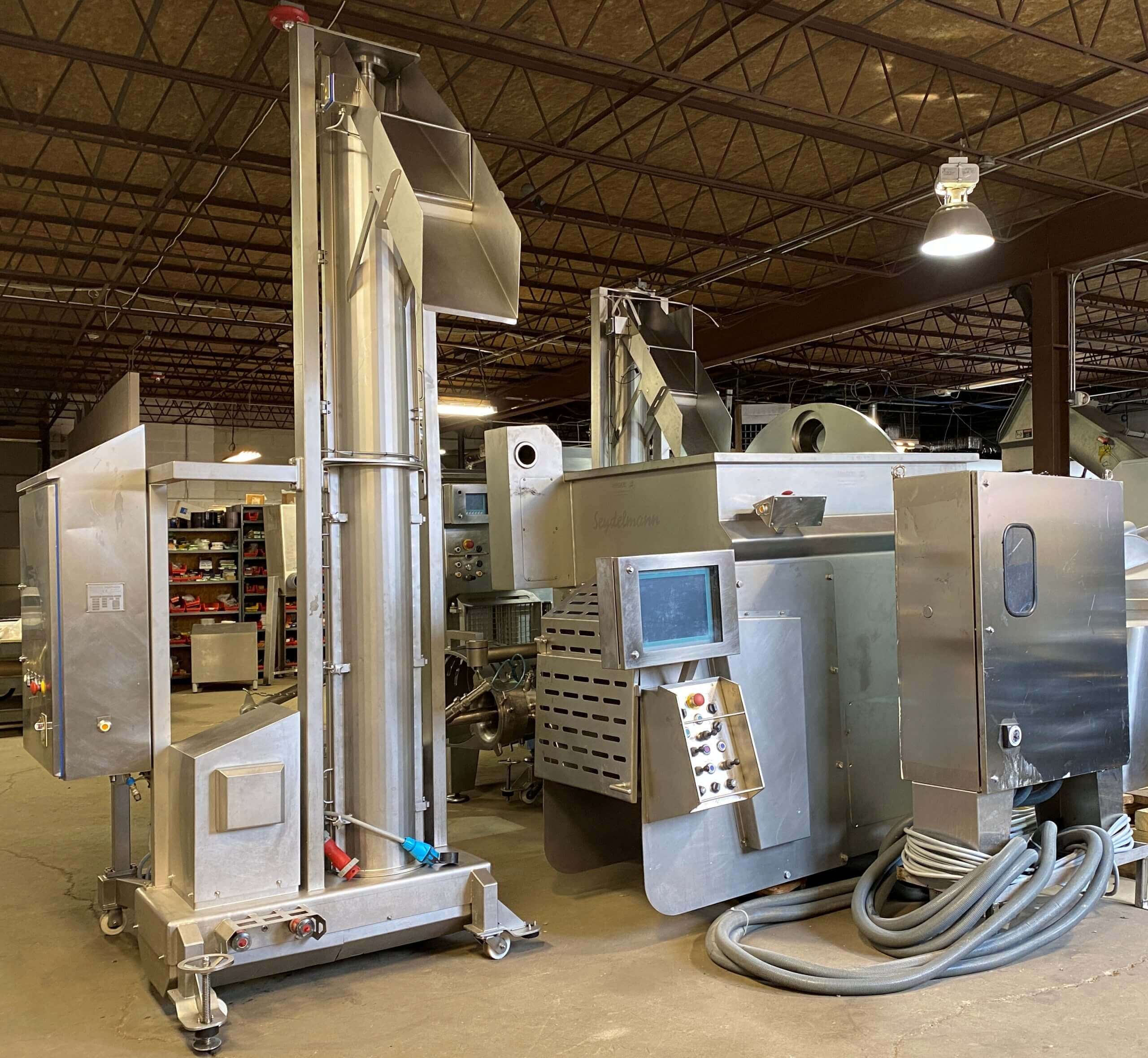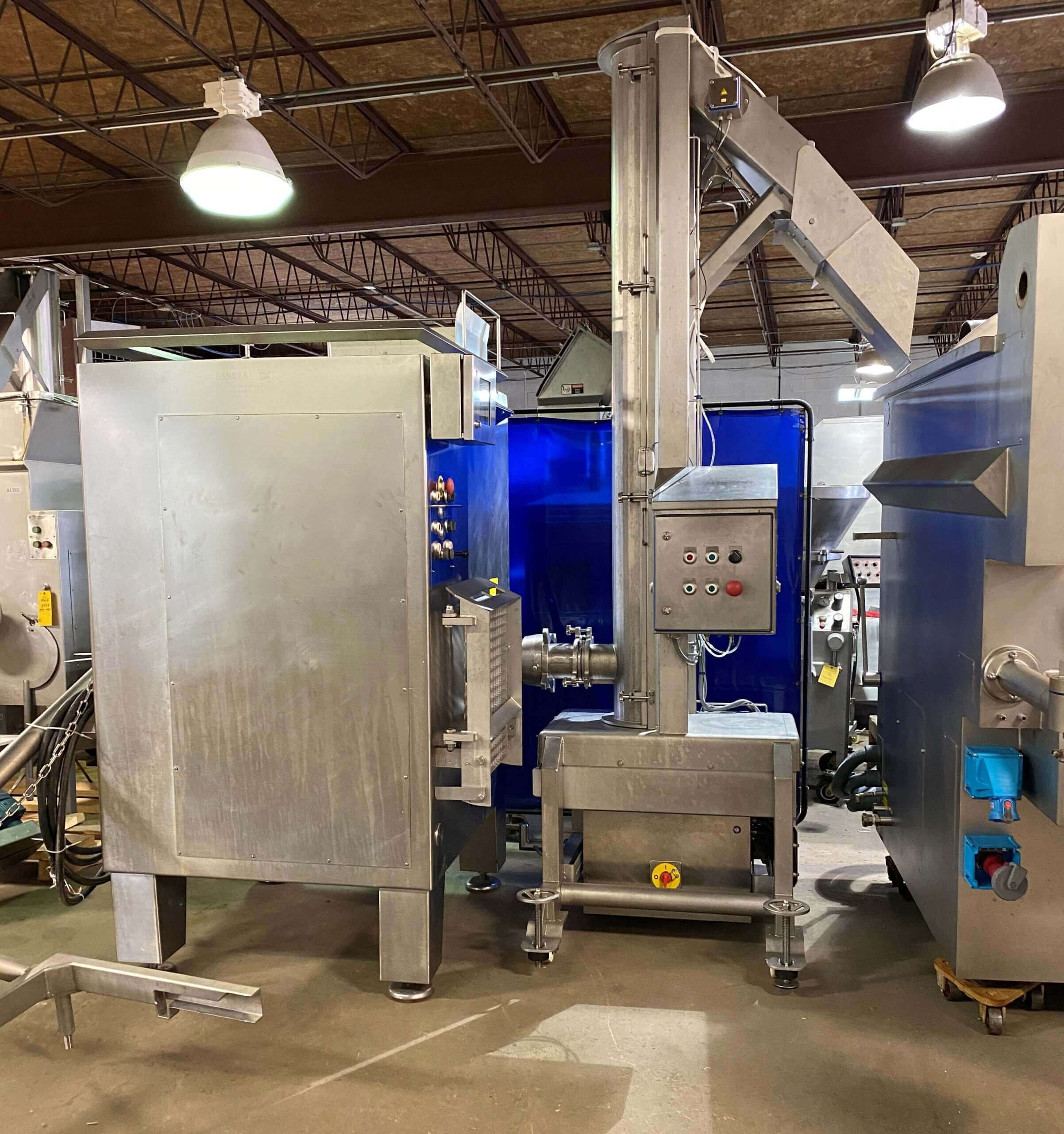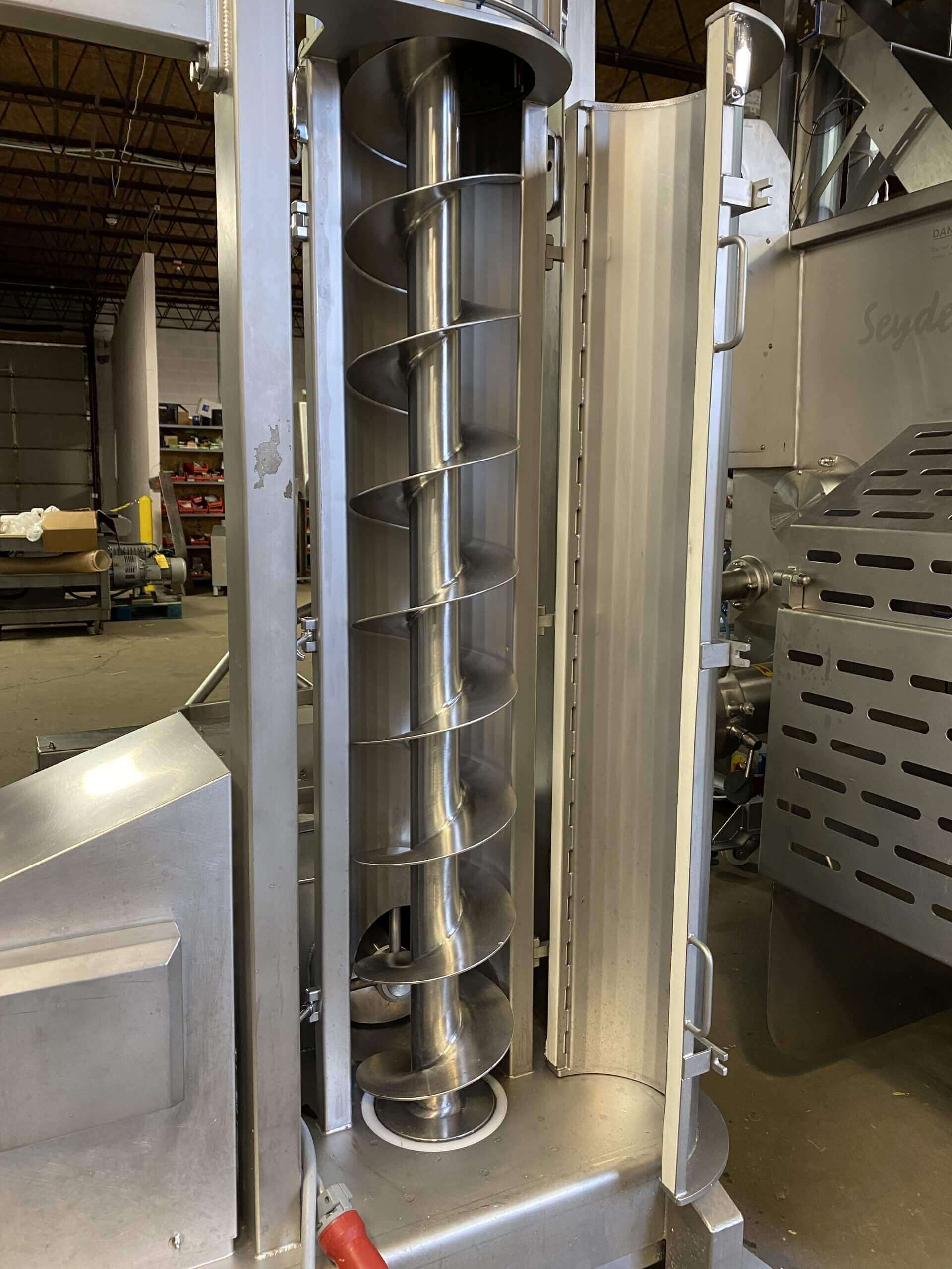 Seydelmann AE130/M Automatic Feed Grinder. 130mm (5.1″) hole plate diameter. Adaptors for single or double cut. 350 liter hopper, two speed working and feeding augers, attached Dump Buggy loader. Seydelmann MRU 1300 Mixer Grinder. 200mm (7.8″) hole plate diameter. 2 speed working auger. 1,300 liter (2,500 Lbs.) hopper. Bottom end discharge door (if second grind is not required). Includes adaptors for single or double cut, load cell platform, water dosing system, CO2 cooling with exhaust cover. Seydelmann SF Screw Conveyor. Directly mounts to AE130/3 Grinder with all connection hardware. Vertically transfers ground meat to Seydelmann Mixer Grinder. D. Seydelmann SF 2 Screw Conveyor. Includes Seydelmann Command 600 control panel, 460V/3PH/60HZ