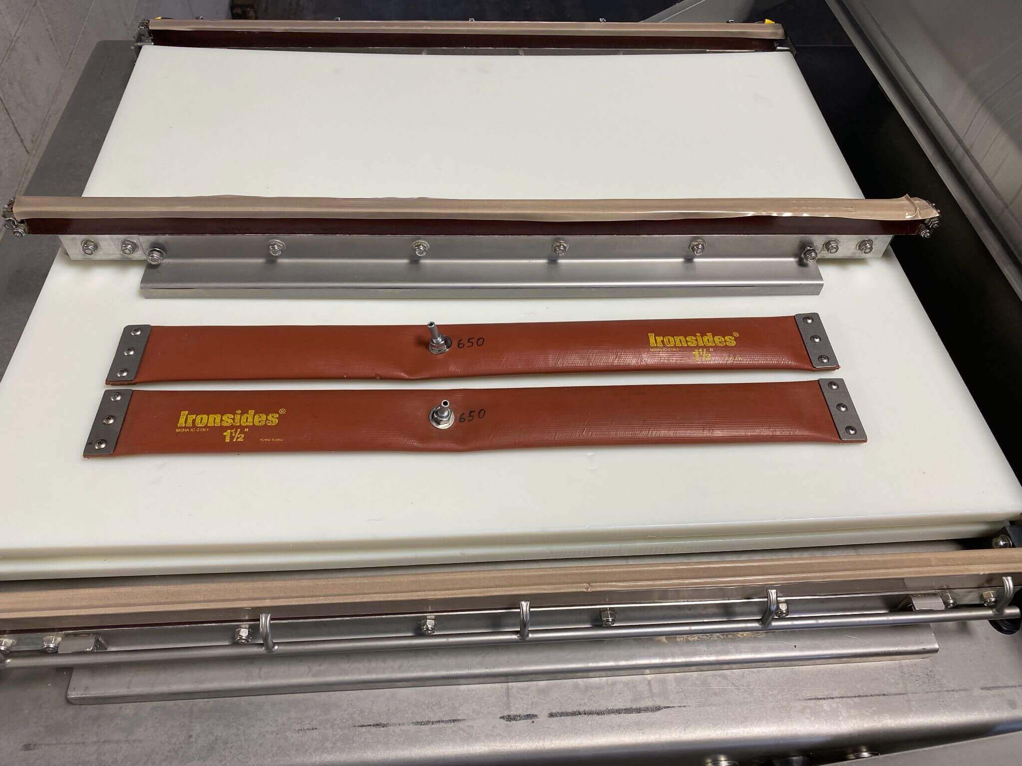SIPROMAC 650A Double Chamber Vacuum Packaging. All stainless steel construction, Chamber height: 8″, Seal bar length: (2) 33.5″, Distance between bars: 31″, Element: double seam band, Gas Flush capability. Busch RA 305 Vacuum Vacuum Pump, 208V/3Ph/60Hz. 14.3 kW. Microprocessor MC-40, Vacuum Sensor -controlled by the Microprocessor, Insert plates for sealing height adjustment. Includes spare seal bar and (2) bladders.