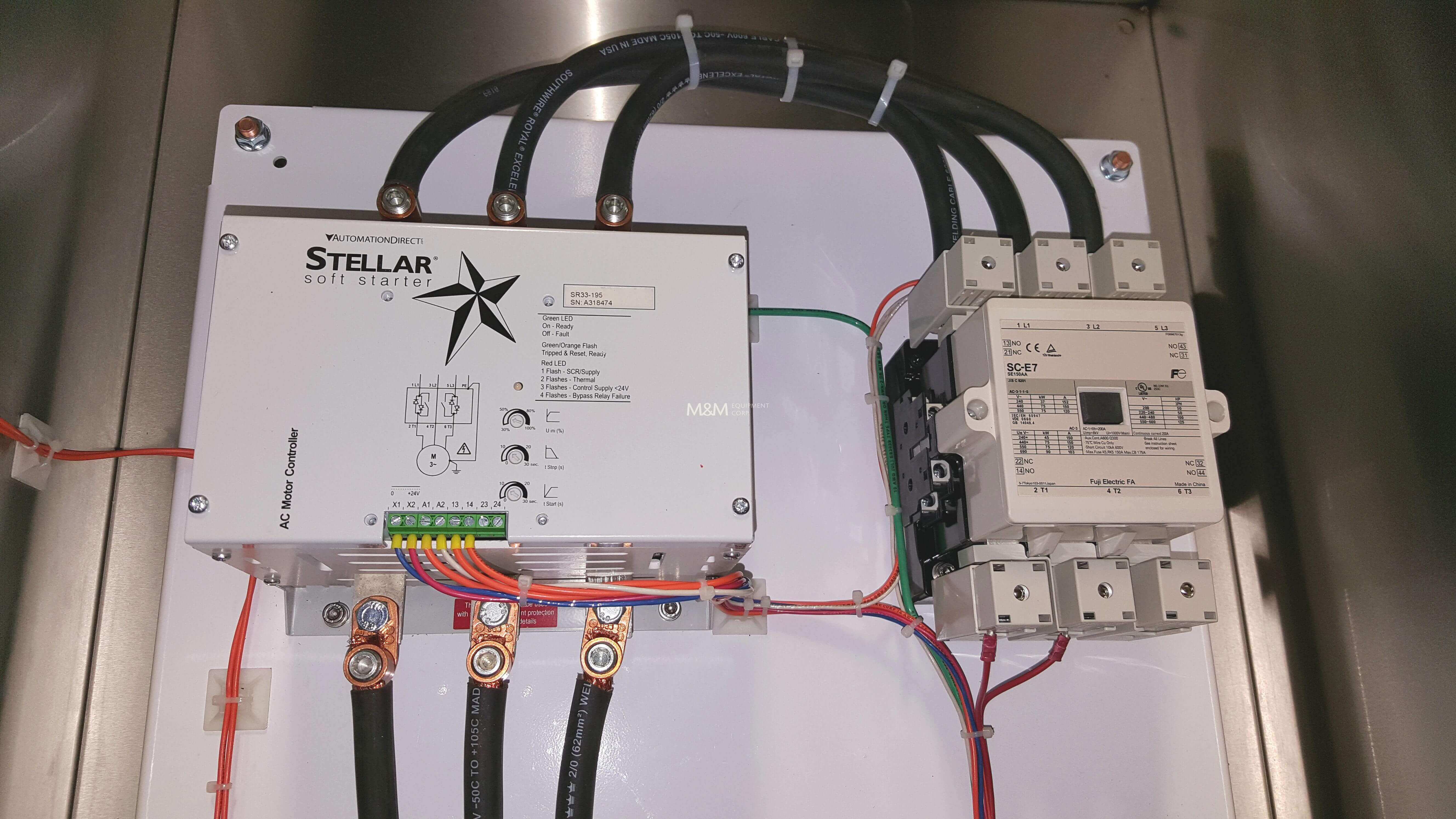 New Soft Start Control Panel, available for 25 to 125 hp motors, Stellar SR33 Soft Starters, thermal over load protection, stainless steel Nema 4X wall mount enclosure, 220V or 440V/3PH/60HZ, up to 135 AMPS. Contact M&M Equipment for additional information.
